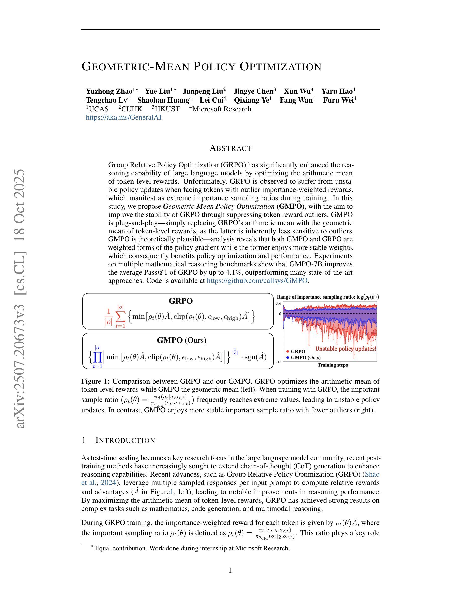 Group Relative Policy Optimization (GRPO) has significantly enhanced the reasoning capability of large language models by optimizing the arithmetic mean of token-level rewards. Unfortunately, GRPO is observed to suffer from unstable policy updates when facing tokens with outlier importance-weighted rewards, which manifest as extreme importance sampling ratios during training. In this study, we propose Geometric-Mean Policy Optimization (GMPO), with the aim to improve the stability of GRPO through suppressing token reward outliers. Instead of optimizing the arithmetic mean, GMPO maximizes the geometric mean of token-level rewards, which is inherently less sensitive to outliers and maintains a more stable range of importance sampling ratio. GMPO is plug-and-play-simply replacing GRPO’s arithmetic mean with the geometric mean of token-level rewards, as the latter is inherently less sensitive to outliers. GMPO is theoretically plausible-analysis reveals that both GMPO and GRPO are weighted forms of the policy gradient while the former enjoys more stable weights, which consequently benefits policy optimization and performance. Experiments on multiple mathematical reasoning benchmarks show that GMPO-7B improves the average Pass@1 of GRPO by up to 4.1%, outperforming many state-of-the-art approaches. Code is available at https://github.com/callsys/GMPO.