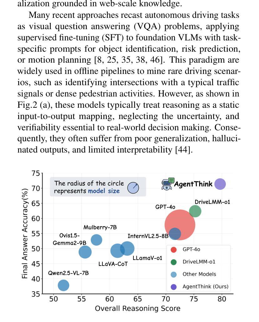 - AgentThink是一个统一框架,旨在解决自动驾驶中视觉语言模型(VLMs)存在的局限,如幻觉、低效推理和缺乏真实世界验证等问题。
