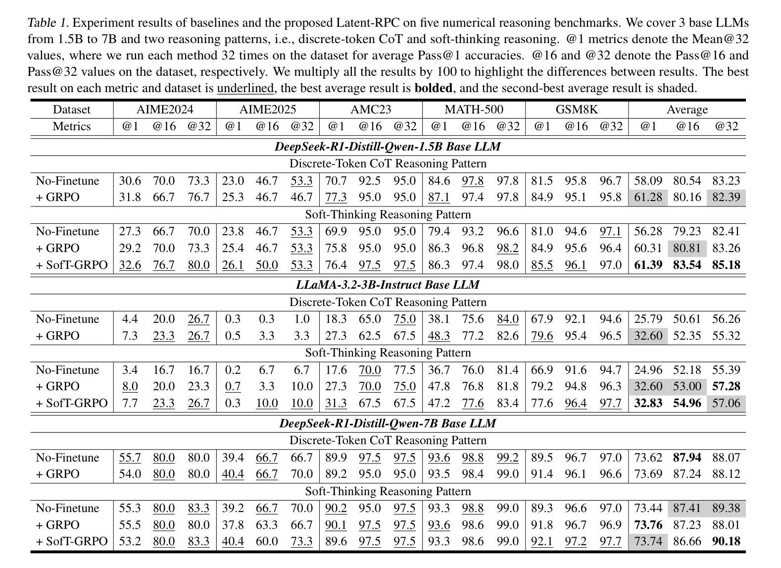 - 尝试结合软思考与GRPO的方法通常表现不如离散符号GRPO。