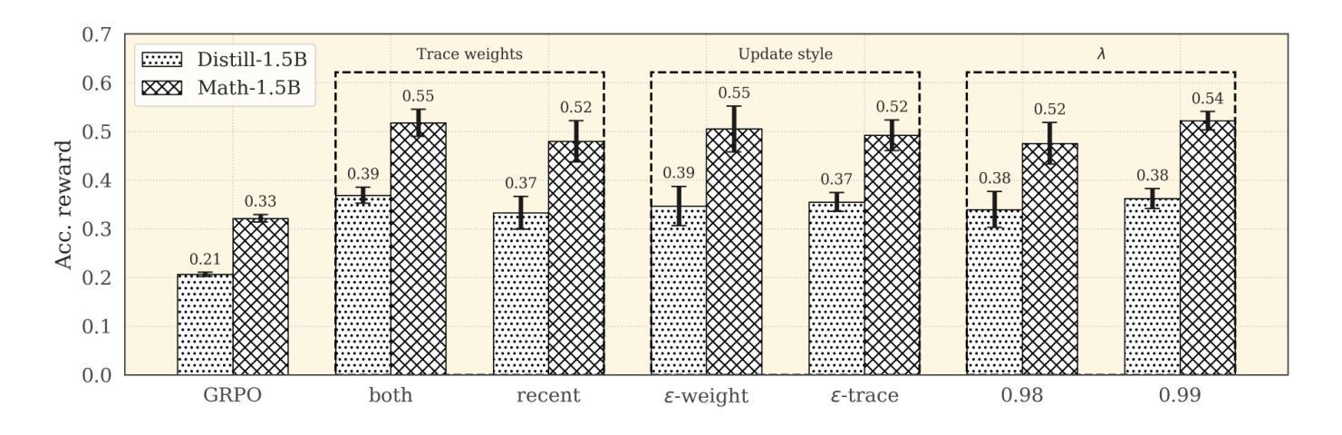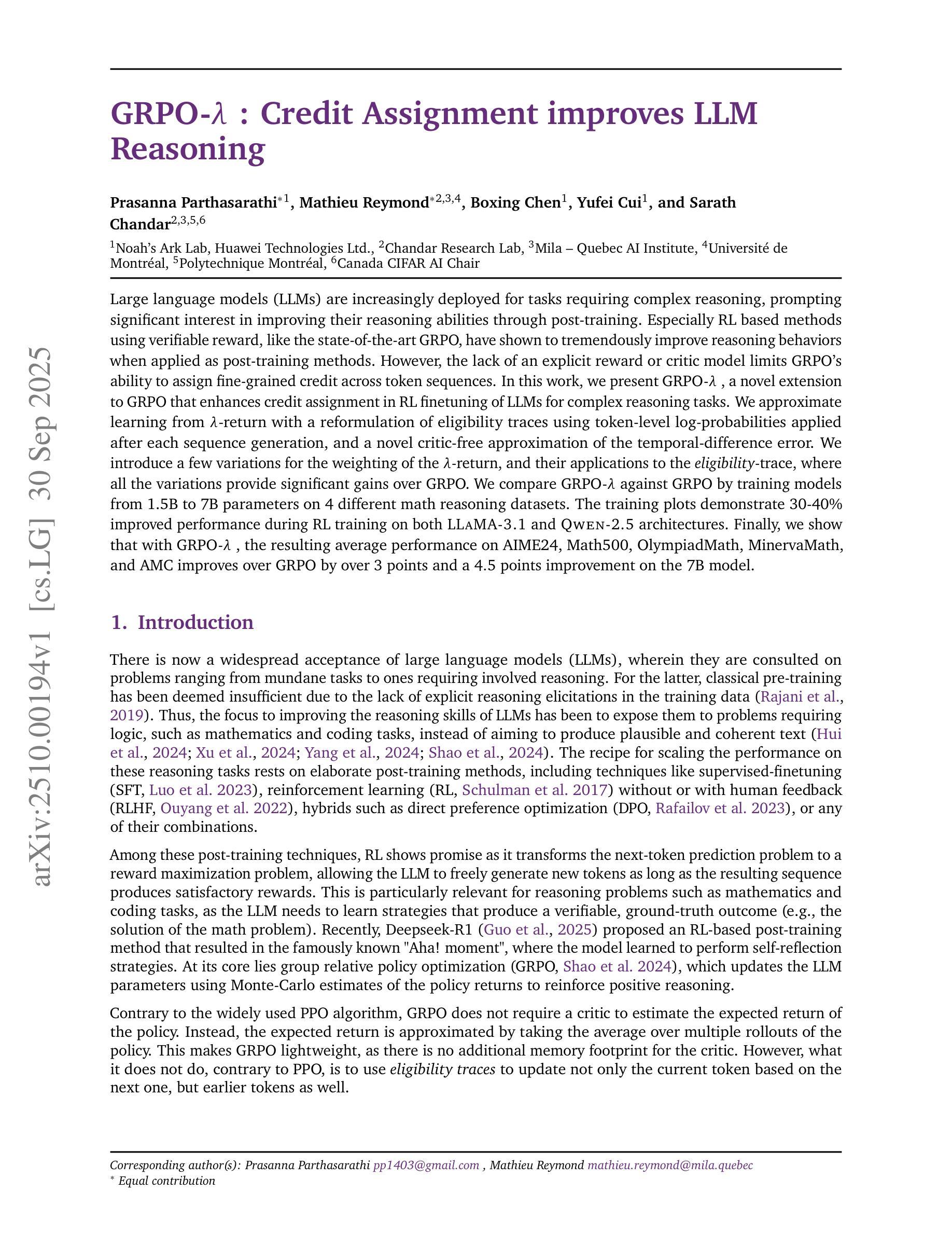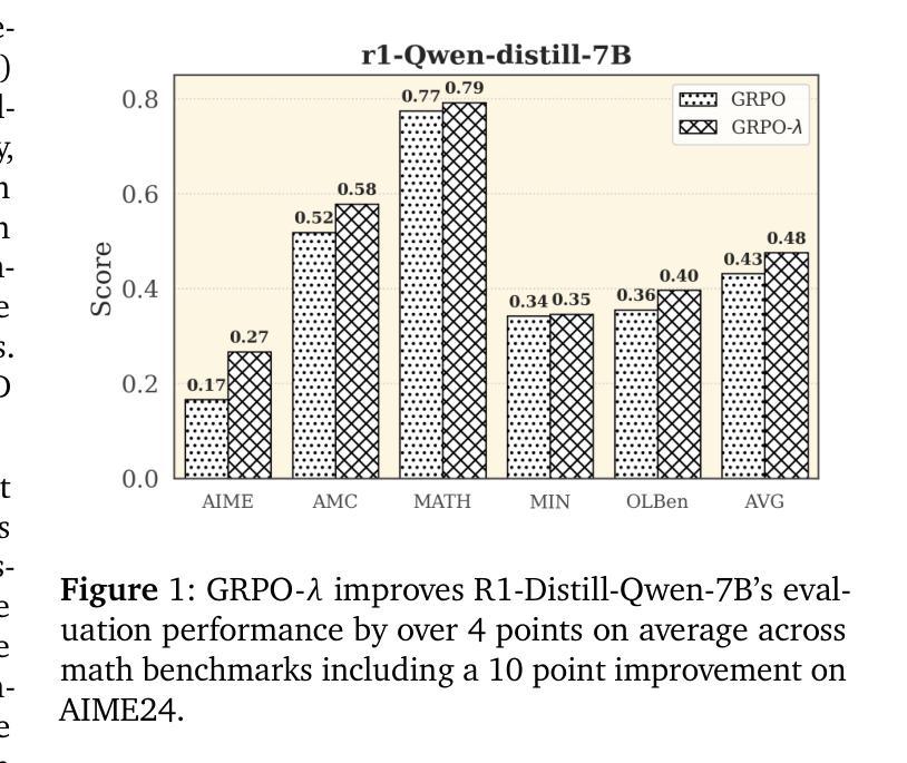 大型语言模型(LLM)越来越多地被部署于需要复杂推理的任务中,这引发了通过后续训练提高其推理能力的浓厚兴趣。特别是基于可验证奖励的强化学习方法,如最先进的GRPO,在作为后续训练方法应用时,已证明能极大地改善推理行为。然而,由于缺乏明确的奖励或评论家模型,GRPO在跨令牌序列分配精细粒度信用方面存在局限性。在这项工作中,我们提出了GRPO-$λ$,这是GRPO的一个新颖扩展,可增强在复杂推理任务的LLM强化学习微调中的信用分配。我们通过使用令牌级别日志概率的资格痕迹重新表述来学习$λ$-回报的近似值,这是在每次序列生成后应用的,以及时间差误差的无评论家近似值。我们介绍了几种$λ$-回报的加权方法及其在资格痕迹中的应用,所有变体都提供了对GRPO的重大收益。我们通过在不同的数学推理数据集上训练从1.5B到7B参数的模型,比较了GRPO-$λ$和GRPO。训练图表明,在LLaMA-3.1和Qwen-2.5架构上,RL训练期间性能提高了30-40%。最后,我们展示了使用GRPO-$λ$,在AIME24、Math500、OlympiadMath、MinervaMath和AMC上的平均性能优于GRPO超过3分,7B模型上改进了4.5分。