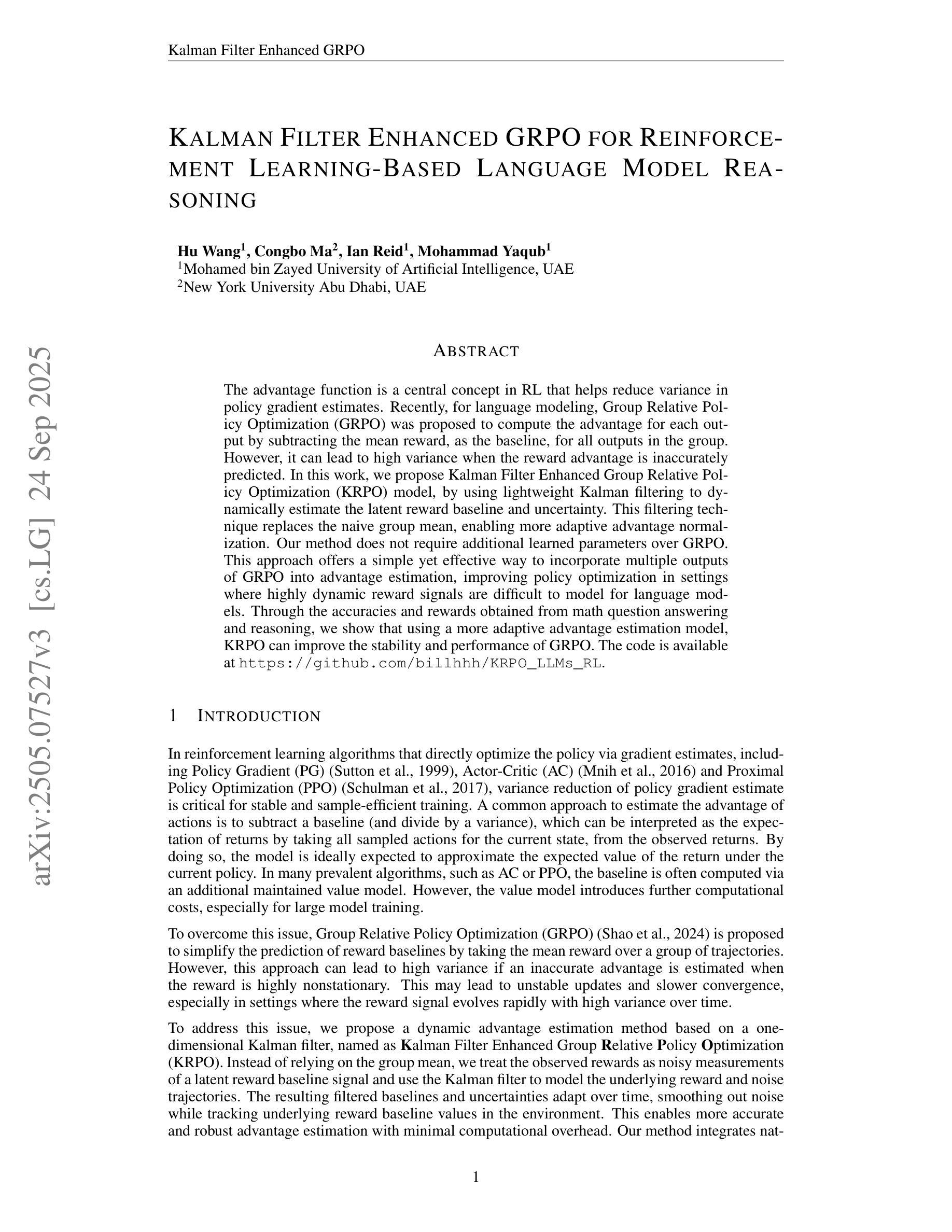 The advantage function is a central concept in RL that helps reduce variance in policy gradient estimates. Recently, for language modeling, Group Relative Policy Optimization (GRPO) was proposed to compute the advantage for each output by subtracting the mean reward, as the baseline, for all outputs in the group. However, it can lead to high variance when the reward advantage is inaccurately predicted. In this work, we propose Kalman Filter Enhanced Group Relative Policy Optimization (KRPO) model, by using lightweight Kalman filtering to dynamically estimate the latent reward baseline and uncertainty. This filtering technique replaces the naive group mean, enabling more adaptive advantage normalization. Our method does not require additional learned parameters over GRPO. This approach offers a simple yet effective way to incorporate multiple outputs of GRPO into advantage estimation, improving policy optimization in settings where highly dynamic reward signals are difficult to model for language models. Through the accuracies and rewards obtained from math question answering and reasoning, we show that using a more adaptive advantage estimation model, KRPO can improve the stability and performance of GRPO. The code is available at https://github.com/billhhh/KRPO_LLMs_RL.