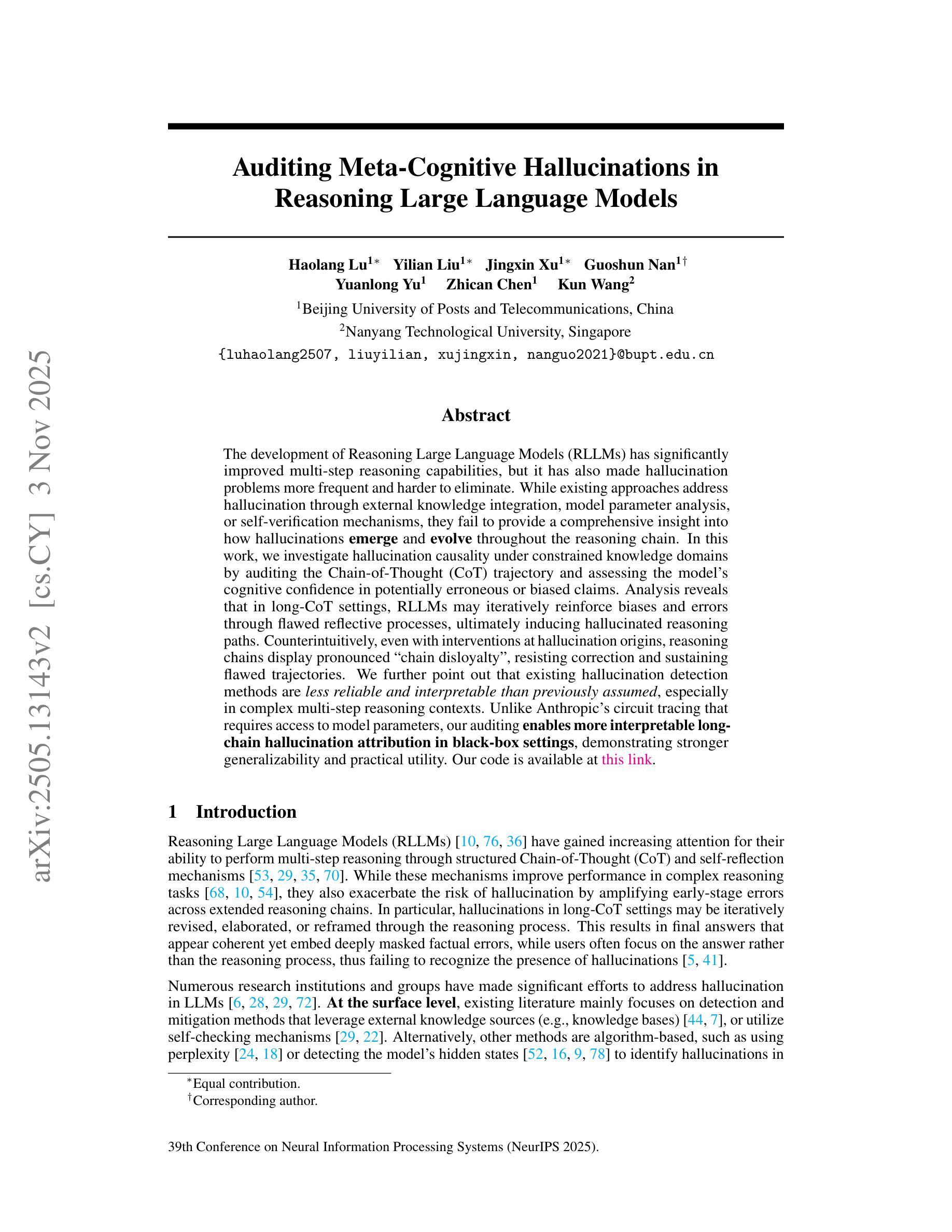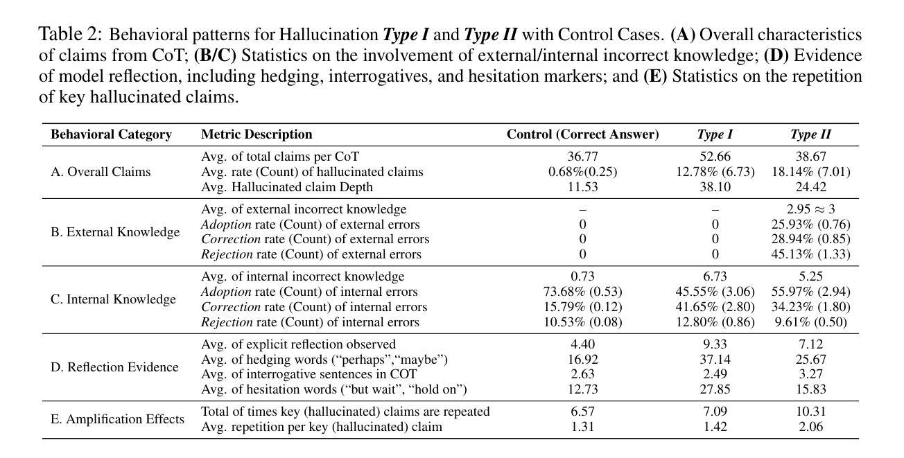大型语言模型的推理发展虽提升了多步推理能力,但也增加了出现幻觉问题的频率和消除难度。现有方法通过外部知识整合、模型参数分析或自我验证来减轻幻觉问题,但难以捕捉幻觉在推理链中的产生和演变过程。本研究通过审计思维链轨迹和评估模型对潜在错误或偏见主张的认知信心,探讨幻觉的因果关系。分析显示,在长篇思维链设置中,大型语言模型可通过缺陷反思推理,不断强化的偏见和错误,最终导致幻觉推理路径。即使对幻觉产生的源头进行直接干预,也常无法消除其影响,因为思维链展现出“链不忠”的特性,即抵抗纠正并倾向于维持错误逻辑。此外,现有的幻觉检测方法在复杂推理场景中不如先前假设的那么可靠和可解释。本研究采用的黑盒审计方法支持可解释的长链幻觉归因,提供更好的通用性和实用性。
