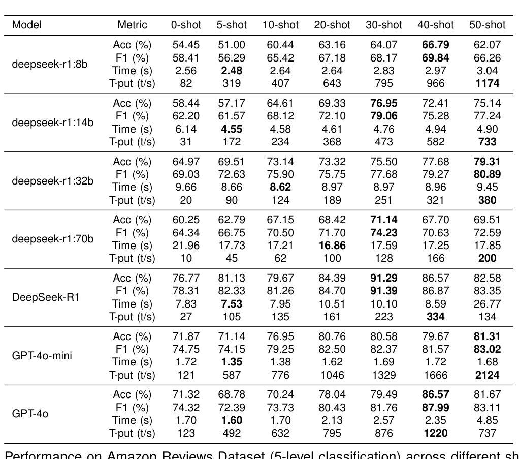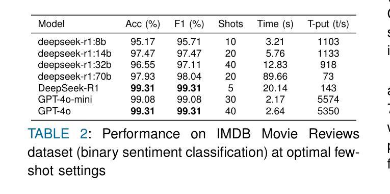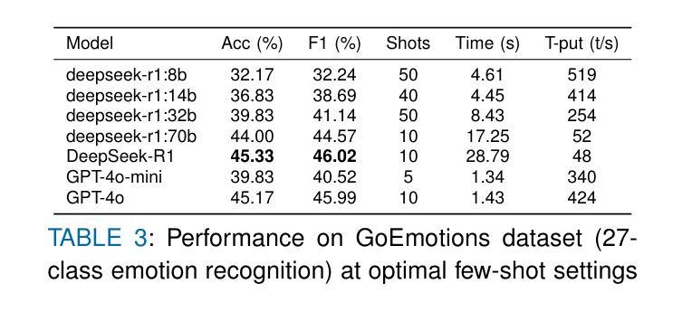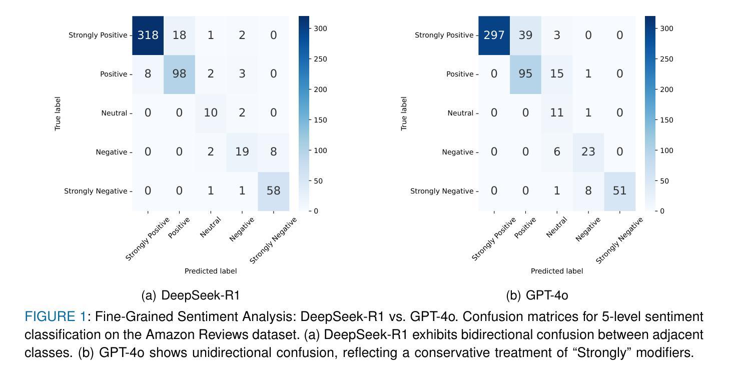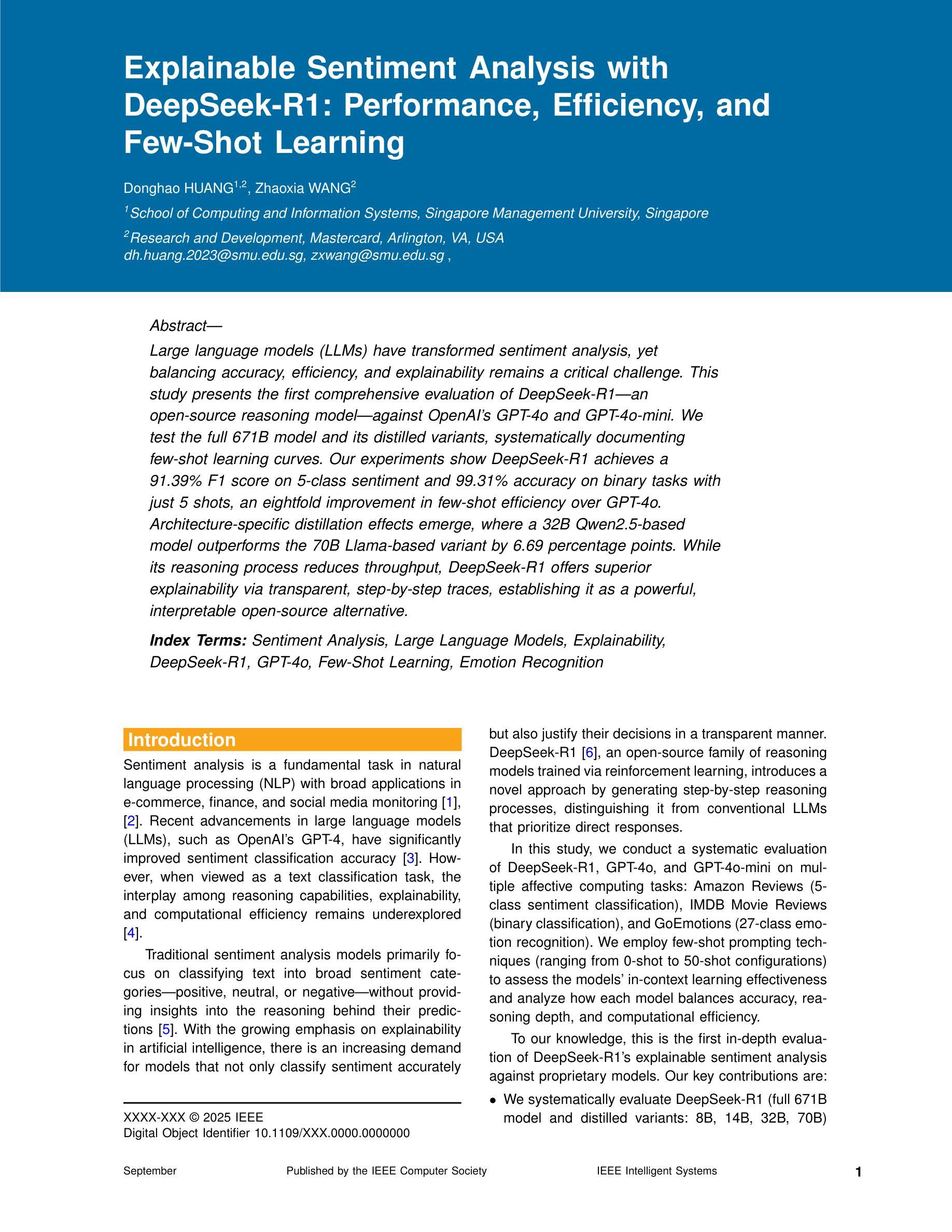 大型语言模型(LLMs)在情感分析领域实现了显著变革,但如何在准确性、效率和可解释性之间取得平衡仍是关键挑战。本研究对DeepSeek-R1这一开源推理模型进行了全面评估,并与OpenAI的GPT-4o和GPT-4o-mini进行了对比。实验结果显示,DeepSeek-R1在5类情感分析上达到91.39%的F1分数,在二元任务上达到99.31%的准确率,仅通过几次学习曲线即可实现。相较于GPT-4o,DeepSeek-R1在少样本学习方面的效率提高了八倍。同时,架构特定的蒸馏效应显现,一个基于Qwen2.5的32B模型在性能上超过了基于Llama的70B模型。虽然推理过程可能影响速度,但DeepSeek-R1凭借透明的逐步跟踪提供了卓越的可解释性,成为强大且可解读的开源替代方案。