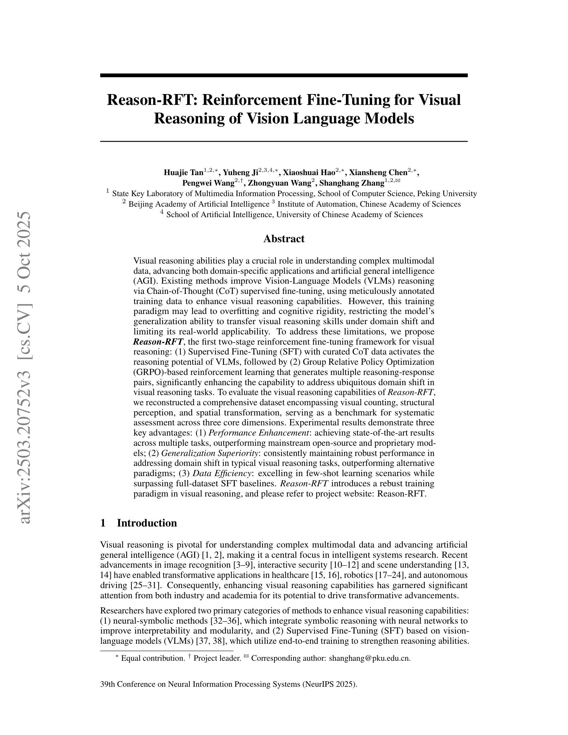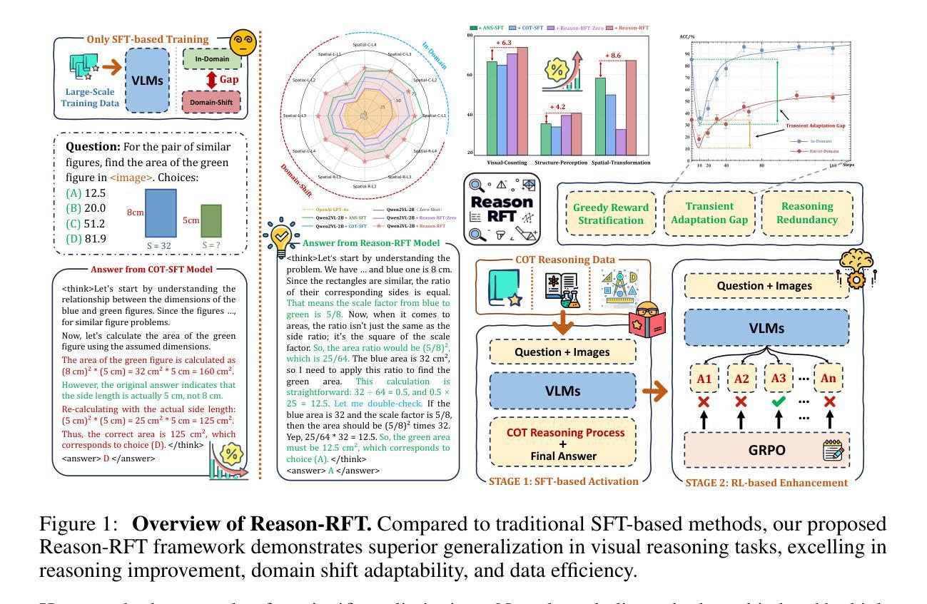 Visual reasoning abilities play a crucial role in understanding complex multimodal data, advancing both domain-specific applications and artificial general intelligence (AGI). Existing methods enhance Vision-Language Models (VLMs) through Chain-of-Thought (CoT) supervised fine-tuning using meticulously annotated data. However, this approach may lead to overfitting and cognitive rigidity, limiting the model’s generalization ability under domain shifts and reducing real-world applicability. To overcome these limitations, we propose Reason-RFT, a two-stage reinforcement fine-tuning framework for visual reasoning. First, Supervised Fine-Tuning (SFT) with curated CoT data activates the reasoning potential of VLMs. This is followed by reinforcement learning based on Group Relative Policy Optimization (GRPO), which generates multiple reasoning-response pairs to enhance adaptability to domain shifts. To evaluate Reason-RFT, we reconstructed a comprehensive dataset covering visual counting, structural perception, and spatial transformation, serving as a benchmark for systematic assessment across three key dimensions. Experimental results highlight three advantages: (1) performance enhancement, with Reason-RFT achieving state-of-the-art results and outperforming both open-source and proprietary models; (2) generalization superiority, maintaining robust performance under domain shifts across various tasks; and (3) data efficiency, excelling in few-shot learning scenarios and surpassing full-dataset SFT baselines. Reason-RFT introduces a novel training paradigm for visual reasoning and marks a significant step forward in multimodal research. Project website: https://tanhuajie.github.io/ReasonRFT