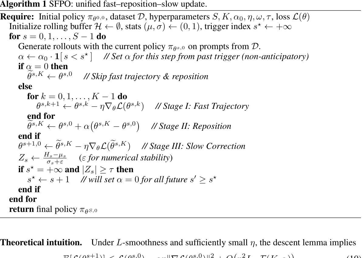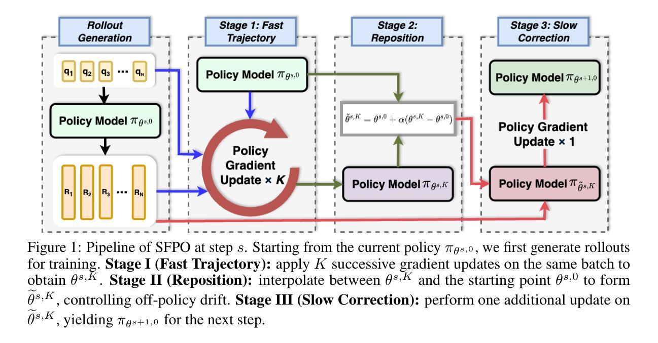 强化学习(RL)在提升大型语言模型(LLM)的推理能力方面发挥着核心作用。然而,基于策略的算法,如集团相对策略优化(GRPO),在早期训练中经常遭遇困境:来自低质量rollouts的噪声梯度导致更新不稳定和效率不高的探索。我们引入了慢快策略优化(SFPO),这是一种简单而高效的框架,通过分解每一步为三个阶段来解决这些限制:在同一批次上进行短暂快速的内步轨迹、控制离策略漂移的定位机制、以及最后的缓慢校正。这种更新前的定位设计保持了目标和rollout过程不变,使得SFPO与现有的策略梯度管道兼容。大量实验表明,SFPO持续提高了稳定性,减少了rollouts,并加速了推理RL训练的收敛。具体而言,它在数学推理基准测试中平均比GRPO高出2.80个点。它还实现了最多减少4.93倍rollouts和最多减少4.19倍匹配GRPO最佳准确率的时钟时间。