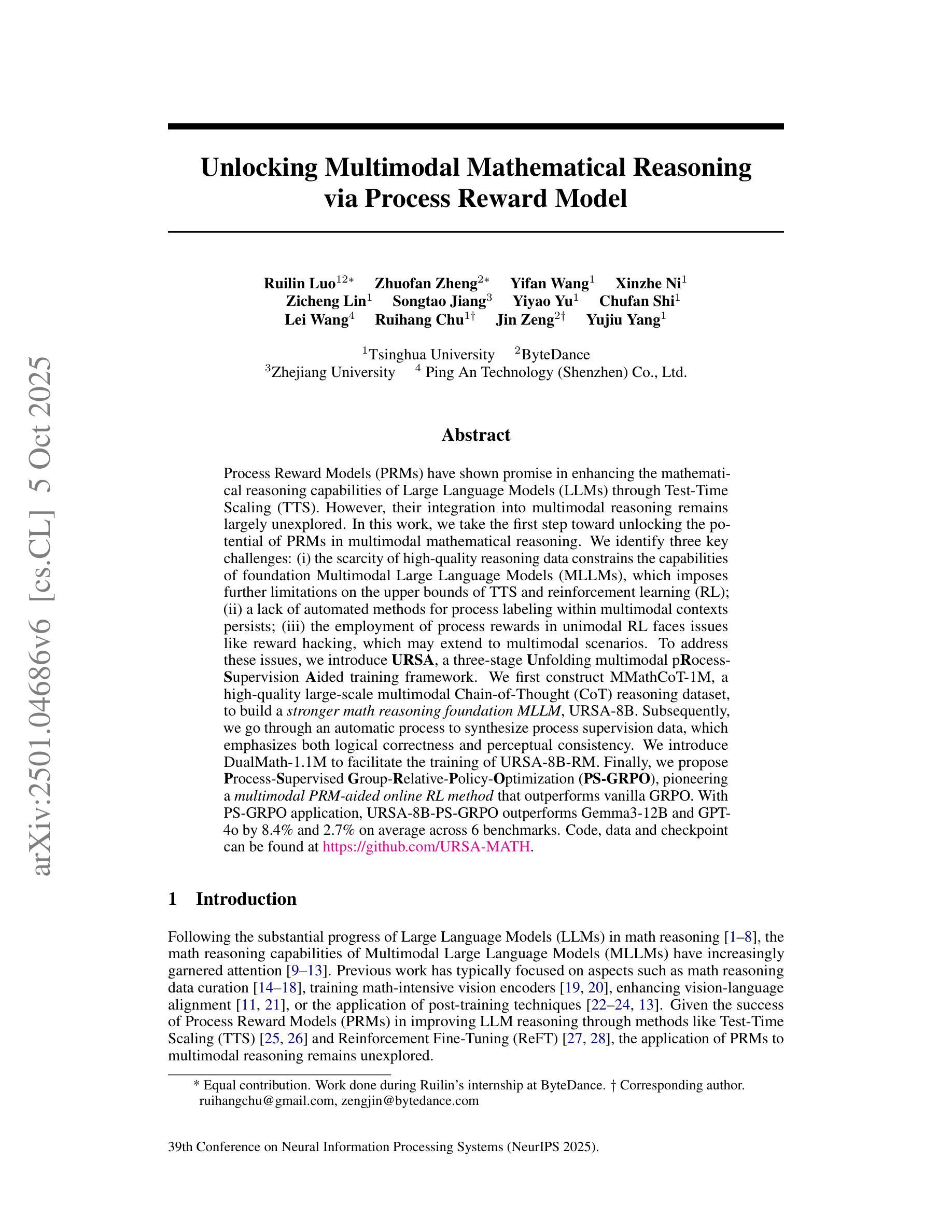 过程奖励模型(PRM)通过测试时间缩放(TTS)在提升大型语言模型(LLM)的数学推理能力方面显示出巨大潜力。然而,它们在多模态推理中的集成仍然鲜有研究。在这项工作中,我们迈出了实现PRM在多模态数学推理中潜力的第一步。我们确定了三个关键挑战:(1)高质量推理数据的稀缺限制了基础多模态大型语言模型(MLLM)的能力,这给TTS和强化学习(RL)的上限带来了进一步限制;(2)在多模态背景下缺乏过程标签的自动化方法仍然存在;(3)在单模态RL中使用过程奖励面临着奖励黑客等问题,这些问题可能会扩展到多模态场景。为了解决这些问题,我们引入了URSA,这是一个三阶段展开的多模态过程监督辅助训练框架。首先,我们构建了MMathCoT-1M这一高质量的大规模多模态思维链(CoT)推理数据集,以建立更强大的数学推理基础MLLM,即URSA-8B。随后,我们通过一个自动过程来合成过程监督数据,这一过程强调逻辑正确性和感知一致性。我们引入了DualMath-1.1M来促进URSA-8B-RM的训练。最后,我们提出了过程监督组相对策略优化(PS-GRPO),开创了一种多模态PRM辅助的在线RL方法,该方法优于标准GRPO。通过应用PS-GRPO,URSA-8B-PS-GRPO在六个基准测试上的平均表现优于Gemma3-12B和GPT-4o,分别提高了8.4%和2.7%。相关代码、数据和检查点可访问https://github.com/URSA-MATH以获取。