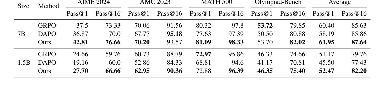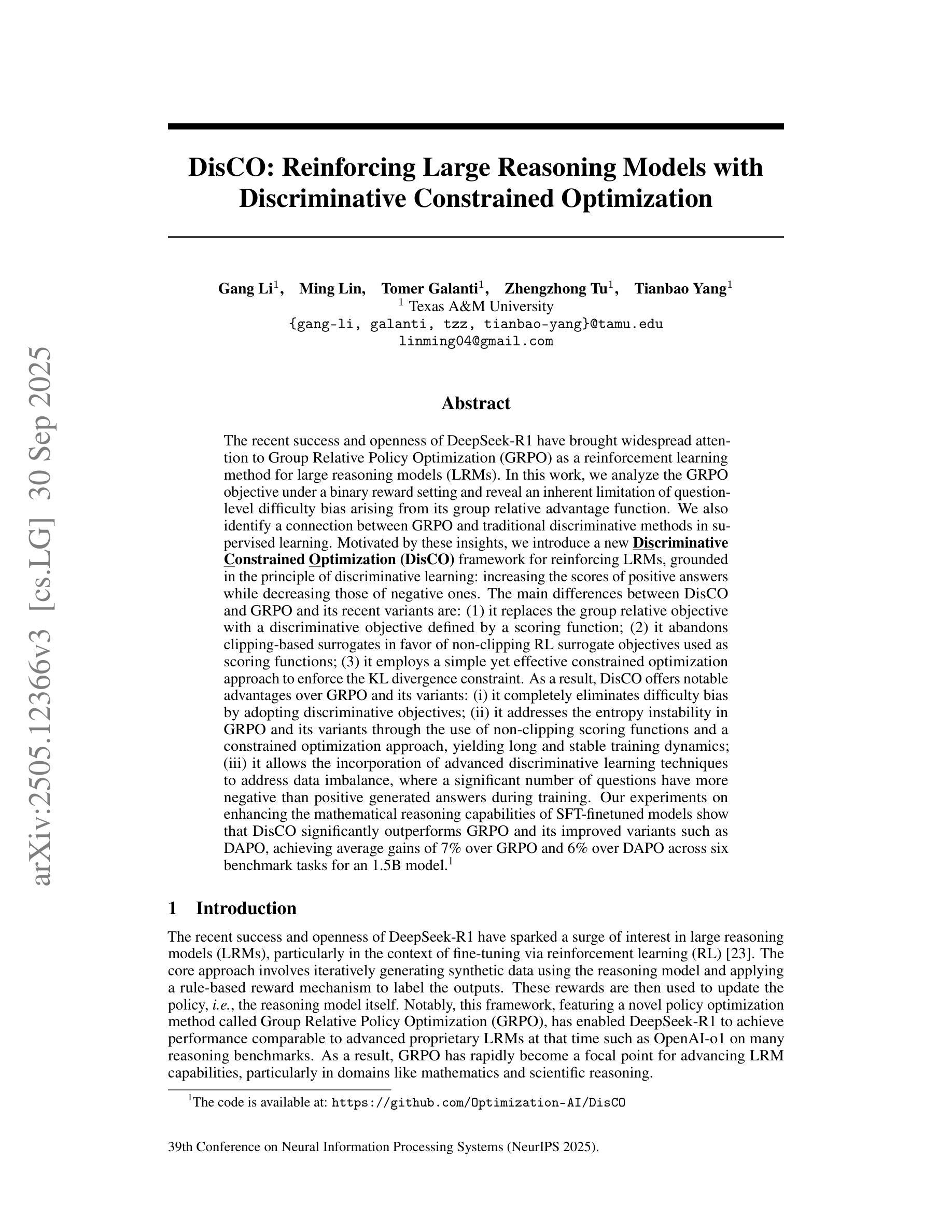 DeepSeek-R1的成功和开放性使Group Relative Policy Optimization(GRPO)作为大型推理模型(LRMs)的强化学习方法受到广泛关注。在这项工作中,我们在二进制奖励设置下分析了GRPO的目标,并揭示了问题级别难度偏差的固有局限性。我们还发现了GRPO与传统监督学习中的判别方法之间的联系。受这些见解的启发,我们为强化LRMs引入了新的Discriminative Constrained Optimization(DisCO)框架,该框架基于判别学习的原则。DisCO与GRPO及其最近变体之间的主要区别在于:(1)它用判别目标替代了组相对目标,该目标由评分函数定义;(2)它放弃了基于剪辑的替代品,转而使用非剪辑RL替代品目标作为评分函数;(3)它采用简单有效的约束优化方法来强制执行KL散度约束。因此,DisCO相对于GRPO及其变体具有显著优势:(i)通过采用判别目标,它完全消除了难度偏见;(ii)它解决了GRPO及其变体中的熵不稳定问题,通过使用非剪辑评分函数和约束优化方法,产生长期稳定的训练动态;(iii)它允许纳入先进的判别学习技术来解决数据不平衡问题,在训练过程中,大量问题的生成答案中负面答案多于正面。我们的实验表明,在提高SFT微调模型的数学推理能力方面,DisCO显著优于GRPO及其改进变体如DAPO,在六个基准任务上,DisCO对GRPO的平均增益为7%,对DAPO的平均增益为6%。