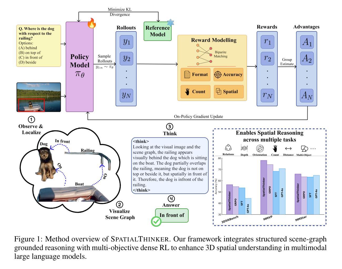 空间多模态大型语言模型(MLLMs)在视觉语言任务中取得了显著进展,但在空间理解方面仍存在挑战。为解决现有空间MLLMs对明确3D输入或特定架构修改的依赖,以及大规模数据集或稀疏监督的限制,我们推出了SpatialThinker。这是一款用强化学习训练而成的具备3D感知能力的MLLM,能够整合结构化空间接地与多步推理。它通过构建任务相关物体和空缘关系的场景图来模拟人类的空间感知,并通过密集的空间奖励进行推理得出答案。SpatialThinker的主要贡献包括:(1)数据合成管道,生成高质量的空间VQA数据集STVQA-7K;(2)在线强化学习,采用多目标密集空间奖励来强化空间接地。在理解和现实世界问答基准测试中,SpatialThinker-7B的表现优于监督微调方法和稀疏强化学习基线,其增益几乎是基础模型的两倍,并超越了GPT-4o。这些结果展示了在空间监督与奖励对齐推理的结合下,实现有限数据的稳健3D空间理解的有效性,并推动MLLM向人类水平的视觉推理发展。