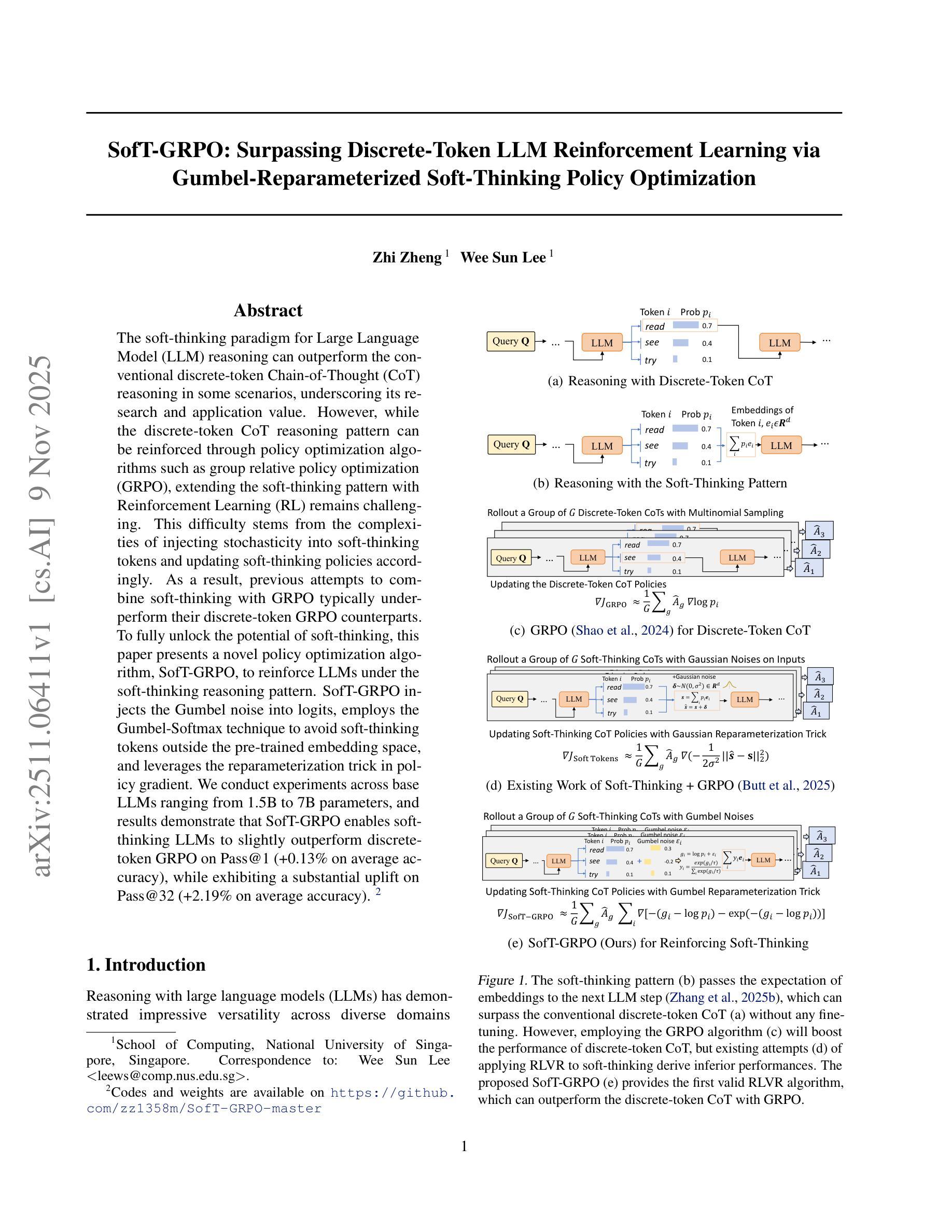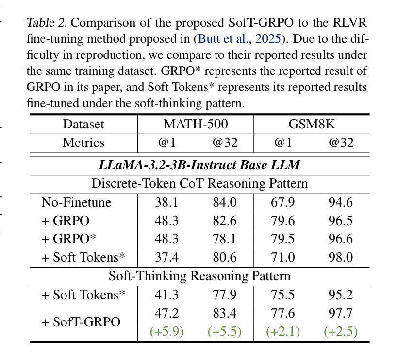 大型语言模型(LLM)推理的软思考范式在某些场景中能优于传统的离散标记链式思维(CoT)推理,这凸显了它的研究和应用价值。然而,虽然通过群体相对策略优化(GRPO)等策略优化算法可以加强离散标记的CoT推理模式,但使用强化学习(RL)来扩展软思考模式仍然具有挑战性。这一难点源于向软思考标记中注入随机性并相应更新软思考策略的复杂性。因此,之前尝试将软思考与GRPO相结合的尝试通常表现不如其离散标记GRPO的同类算法。为了充分发挥软思考的优势,本文提出了一种新的策略优化算法SofT-GRPO,以在软思考推理模式下加强LLM。SofT-GRPO向逻辑概率中注入Gumbel噪声,采用Gumbel-Softmax技术避免软思考标记超出预训练嵌入空间,并利用策略梯度中的重参数化技巧。我们在基础LLM上进行了实验,参数范围从1.5B到7B,结果表明SofT-GRPO使软思考LLM在Pass@1(平均准确率提高0.13%)上略微优于离散标记GRPO,而在Pass@32(平均准确率提高2.19%)上有显著的提升。相关代码和权重可在https://github.com/zz1358m/SofT-GRPO-master找到。