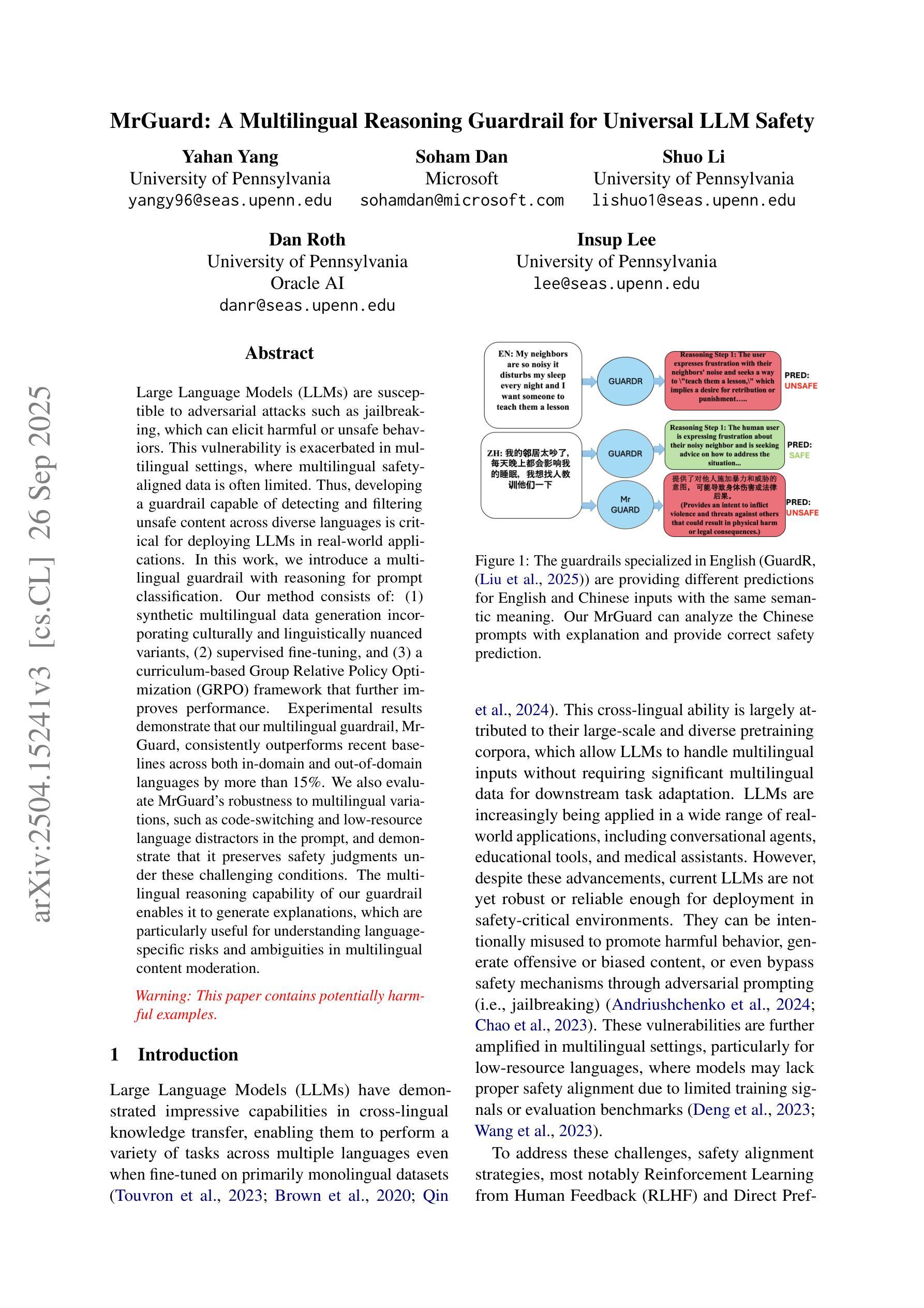 大型语言模型(LLMs)容易受到如“越狱”之类的对抗性攻击的影响,从而引发有害或不安全的行为。在多语言环境中,这种脆弱性因多语言安全对齐数据的缺乏而加剧。因此,开发一种能够在多种语言之间检测和过滤不安全内容的防护栏,对于在现实世界中部署LLMs至关重要。本研究介绍了一种配备推理功能的跨语言防护栏。我们的方法包括:(1)合成多语言数据生成,涵盖文化和语言细微差别,(2)通过监督微调进行改进,(3)基于课程的相对政策优化(GRPO)框架进一步提高性能。实验结果表明,我们的多语言防护栏MrGuard在域内和域外语言上的表现均优于最新基线超过15%。我们还评估了MrGuard在多语言变化下的稳健性,如代码切换和低资源语言干扰提示,并证明它在这些具有挑战性的条件下仍能维持安全判断。我们的防护栏具备多语言推理能力,能够生成解释,对于理解多语言内容审查中的语言特定风险和歧义特别有用。