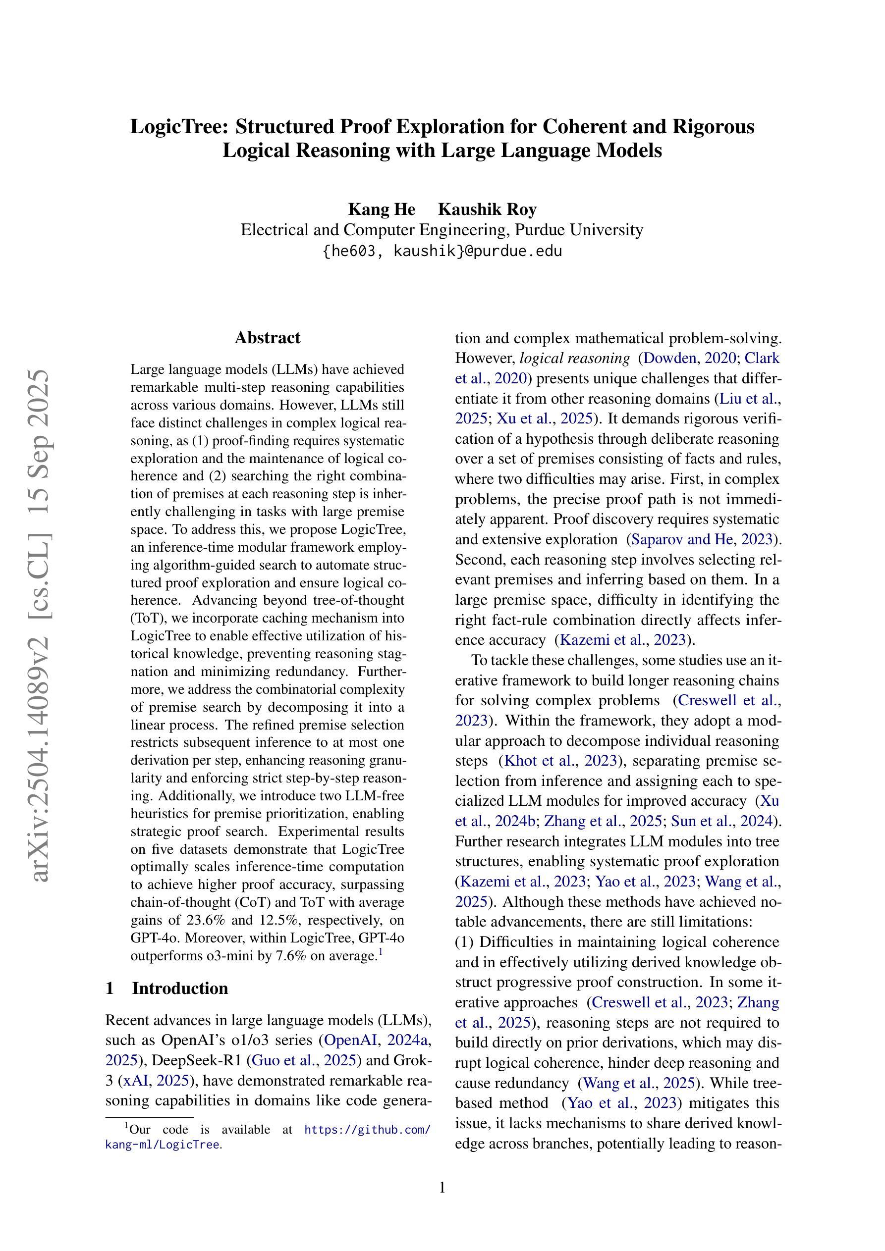 大型语言模型(LLM)已在多个领域展现出显著的多步推理能力。然而,在复杂的逻辑推理方面,LLM仍面临独特的挑战。因为(1)证明寻找需要系统的探索和维持逻辑连贯性;(2)在具有大量前提空间的任务中,搜索每一步推理的正确前提组合本质上是具有挑战性的。为了解决这一问题,我们提出了LogicTree,这是一个推理时间模块化框架,采用算法指导的搜索来自动探索结构化证明并确保逻辑连贯性。超越思维树(ToT),我们在LogicTree中引入了缓存机制,以有效利用历史知识,防止推理停滞并尽量减少冗余。此外,我们将前提搜索的组合复杂性分解为线性过程来解决。精细的前提选择将后续推理限制为每一步最多一个推导,提高了推理的粒度并实施了严格的逐步推理。此外,我们引入了两种无需大型语言模型的启发式方法来优先处理前提,以实现战略性的证明搜索。在五个数据集上的实验结果表明,LogicTree能够最优地扩展推理时间的计算,提高证明准确性,超过思维链(CoT)和ToT,在GPT-4o上的平均增益为23.6%和12.5%。此外,在LogicTree内部,GPT-4o的平均表现优于o3-mini 7.6%。