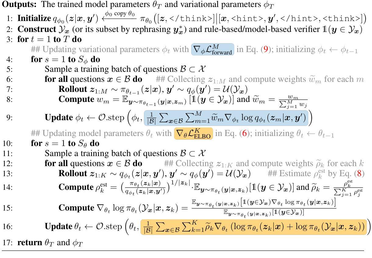 - 引入变分推理框架,将思考轨迹视为潜在变量,通过变分推断优化。