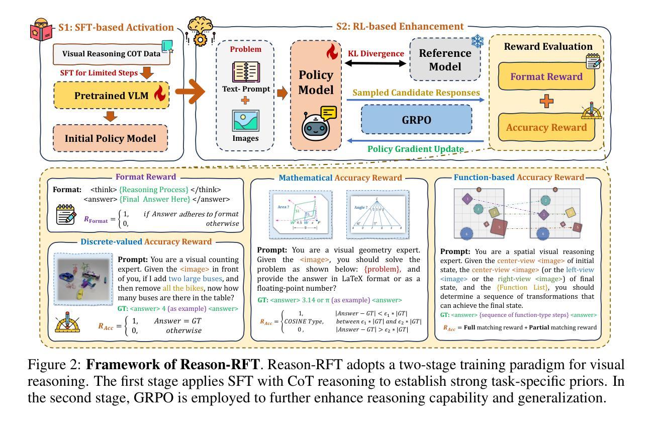 - Reason-RFT框架包含两个阶段:第一阶段通过监督精细调机激活VLM的推理潜力;第二阶段利用基于群体相对策略优化的强化学习来提升模型适应不同领域的能力。