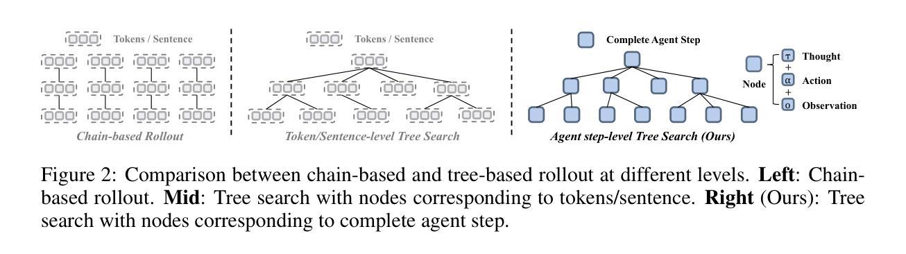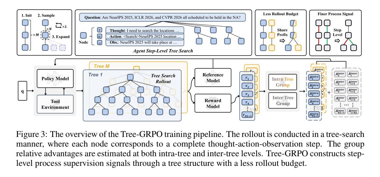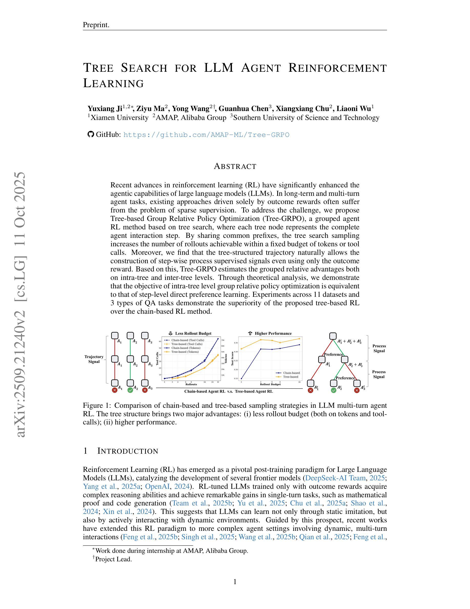强化学习(RL)的最新进展极大地提升了大型语言模型(LLM)的代理能力。在长期和多轮代理任务中,仅由结果奖励驱动的方法常常面临监督稀疏的问题。为解决此挑战,我们提出了基于树搜索的分组代理RL方法——Tree-GRPO。树中的每个节点代表完整的代理交互步骤。通过共享公共前缀,树搜索采样在固定的令牌或工具调用预算内增加了可实现滚动次数。此外,树结构轨迹自然地允许使用仅结果奖励构建逐步过程监督信号。基于此,Tree-GRPO估计了树内和树间的分组相对优势。理论分析表明,树内级别的群组相对策略优化的目标与步骤级别的直接偏好学习的目标等效。在11个数据集和3种问答任务上的实验表明,基于树的RL优于基于链的RL方法。