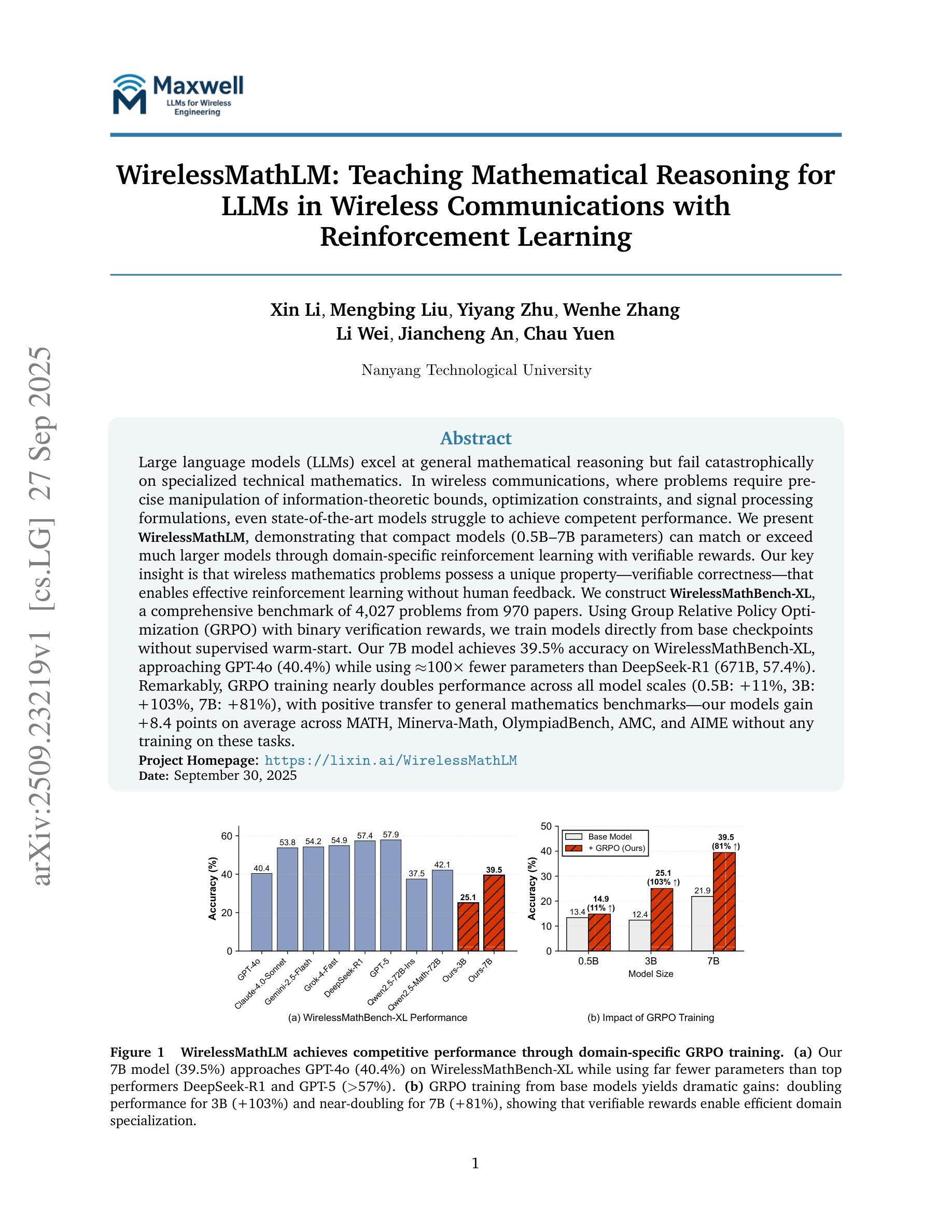 大型语言模型(LLM)在一般数学推理方面表现出色,但在专业技术数学上却遭遇了重大失败。在无线通信领域,问题需要对信息理论界限、优化约束和信号处理公式进行精确操作,即使是最先进的模型也很难实现出色的性能。我们提出了WirelessMathLM,证明通过领域特定的强化学习与可验证奖励,小型模型(0.5B-7B参数)可以与更大的模型相匹敌甚至超过它们。我们的关键见解是,无线数学问题具有可验证正确性的独特属性,这可以在没有人类反馈的情况下实现有效的强化学习。我们构建了WirelessMathBench-XL,这是一个包含4027个问题的综合基准测试,来自970篇论文。我们使用带有二进制验证奖励的Group Relative Policy Optimization(GRPO)直接从基准点训练模型,无需监督预热启动。我们的7B模型在WirelessMathBench-XL上达到了39.5%的准确率,接近GPT-4o(40.4%),同时使用的参数比DeepSeek-R1(671B,57.4%)少了约100倍。值得注意的是,GRPO训练在所有模型规模上几乎将性能提高了一倍(0.5B提高11%,3B提高103%,7B提高81%),并且正向转移到一般数学基准测试——我们的模型在MATH、Minerva-Math、OlympiadBench、AMC和AIME等任务上平均提高了8.4分,而无需对这些任务进行任何训练。