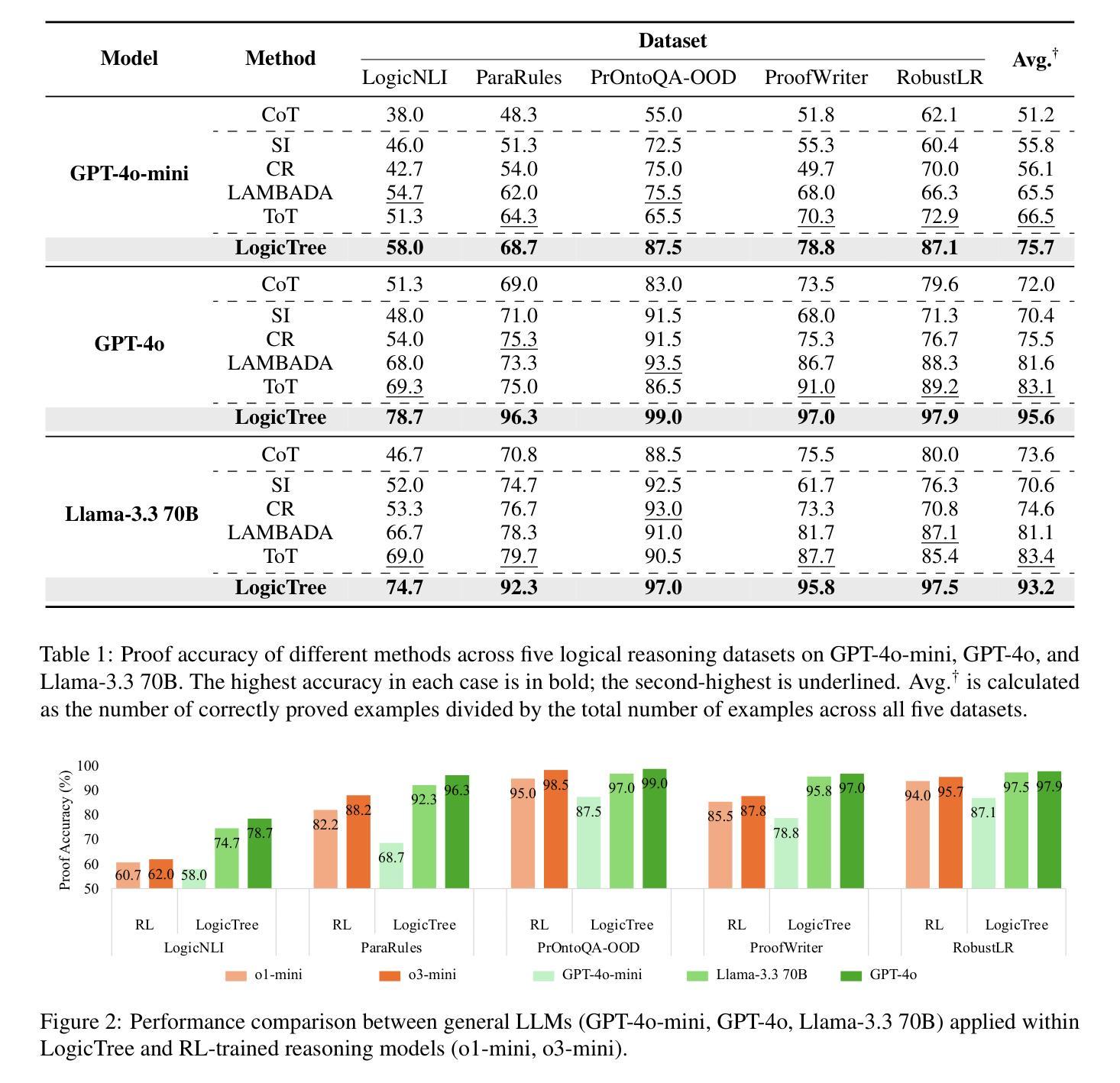 大型语言模型(LLMs)在多步推理领域展现出显著能力,但在复杂逻辑推理方面仍面临挑战。针对这些问题,本文提出了LogicTree框架,通过算法引导搜索来自动化结构证明探索并确保逻辑连贯性。LogicTree引入缓存机制,避免推理停滞和冗余,并分解复杂的前提搜索为线性过程。实验结果表明,LogicTree在五个数据集上实现了更高的证明准确性,相对于链式思维(CoT)和思维树(ToT)平均提升了23.6%和12.5%。GPT-4o在LogicTree内的表现优于o3-mini,平均提高了7.6%。
