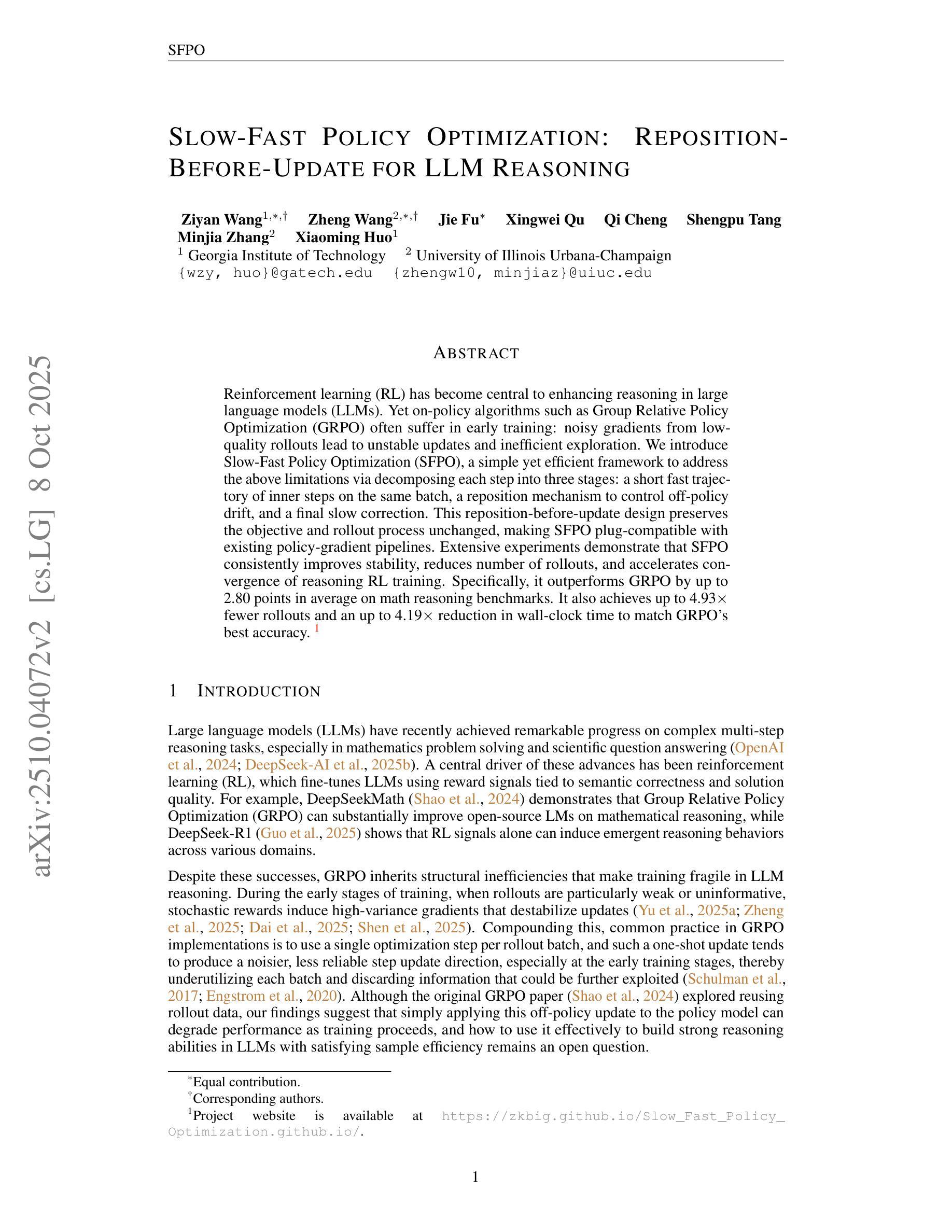 Reinforcement learning (RL) has become central to enhancing reasoning in large language models (LLMs). Yet on-policy algorithms such as Group Relative Policy Optimization (GRPO) often suffer in early training: noisy gradients from low-quality rollouts lead to unstable updates and inefficient exploration. We introduce Slow-Fast Policy Optimization (SFPO), a simple yet efficient framework to address these limitations via decomposing each step into three stages: a short fast trajectory of inner steps on the same batch, a reposition mechanism to control off-policy drift, and a final slow correction. This reposition-before-update design preserves the objective and rollout process unchanged, making SFPO plug-compatible with existing policy-gradient pipelines. Extensive experiments demonstrate that SFPO consistently improves stability, reduces rollouts, and accelerates convergence of reasoning RL training. Specifically, it outperforms GRPO by up to 2.80 points in average on math reasoning benchmarks. It also achieves up to 4.93\texttimes{} fewer rollouts and an up to 4.19\texttimes{} reduction in wall-clock time to match GRPO’s best accuracy.