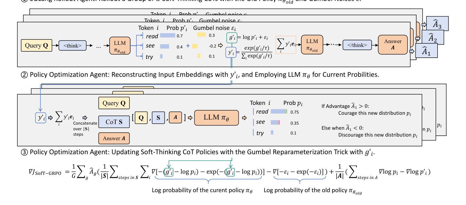 - SofT-GRPO通过注入Gumbel噪声到logits、使用Gumbel-Softmax技术避免软思考标记超出预训练嵌入空间和使用策略梯度中的重参数化技巧来实现其目标。