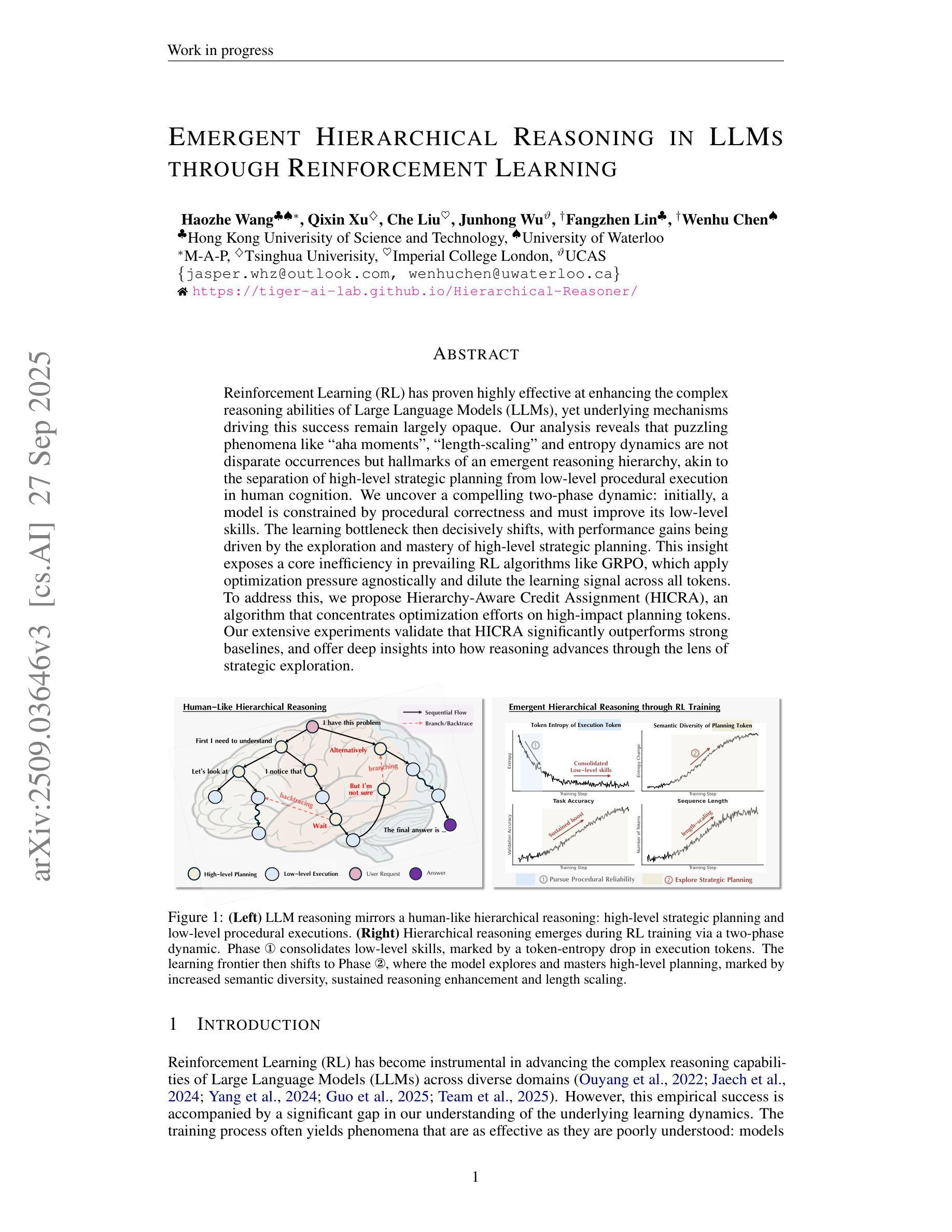 Emergent Hierarchical Reasoning in LLMs through Reinforcement Learning