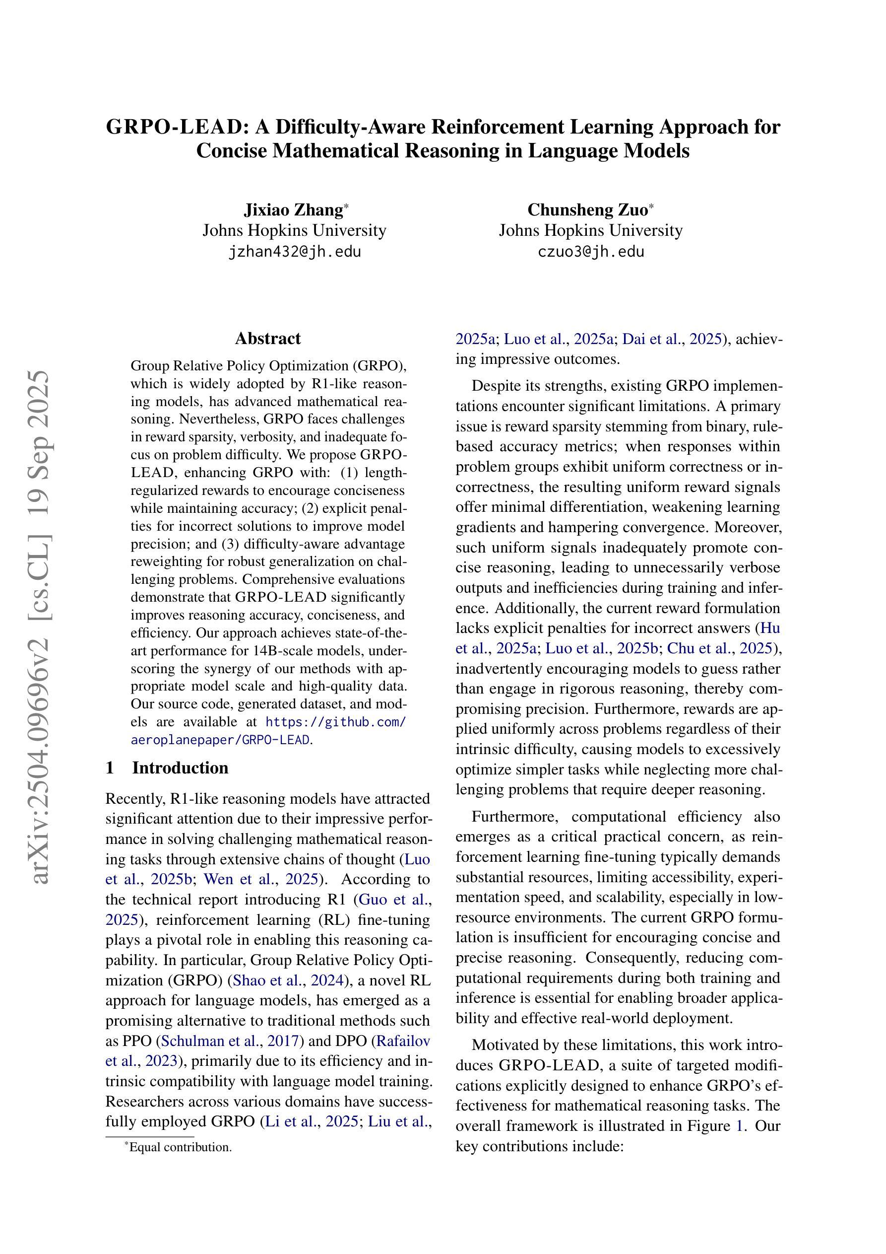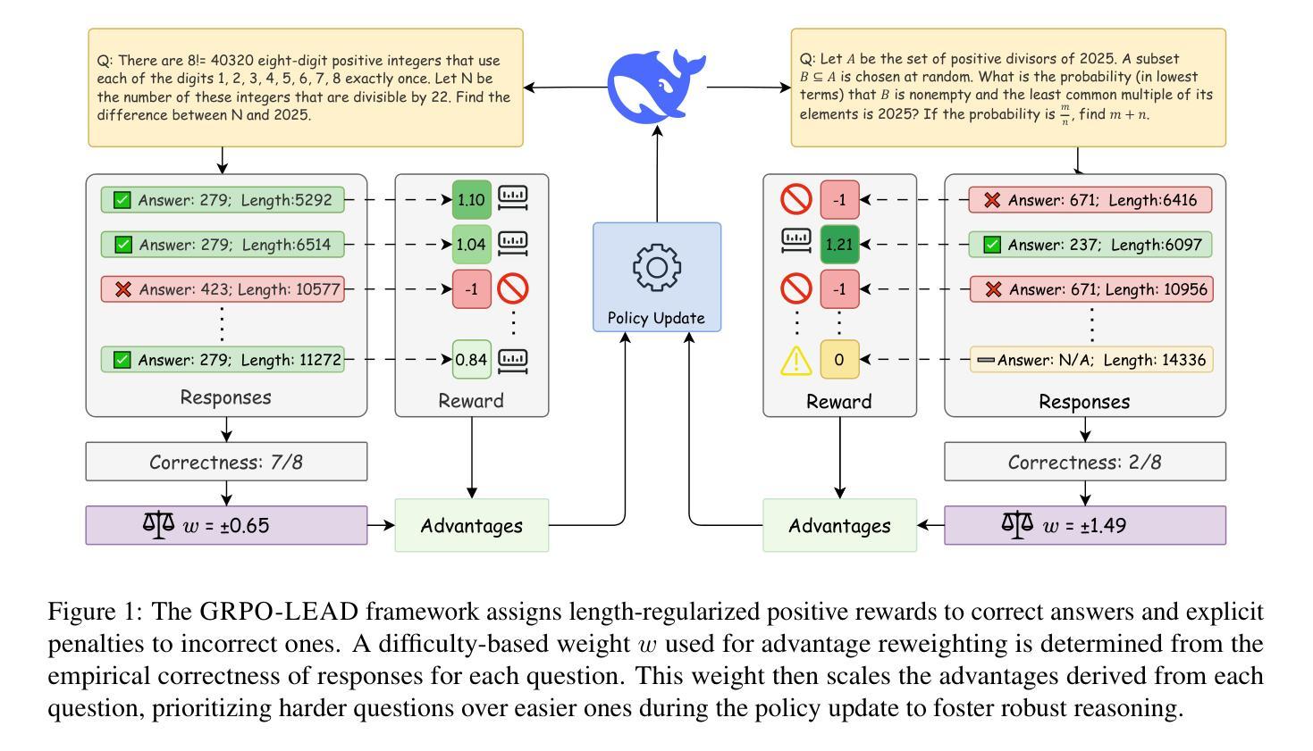 集团相对策略优化(GRPO)被R1类推理模型广泛应用,具有先进的数学推理能力。然而,GRPO面临奖励稀疏、冗余以及缺乏对问题难度关注度的挑战。我们提出GRPO-LEAD,通过以下三个方面增强GRPO:(1)长度正则化奖励,在保持准确性的同时鼓励简洁性;(2)对错误解决方案的明确惩罚,以提高模型精度;(3)难度感知优势重新加权,以实现在具有挑战性的问题上的稳健泛化。全面评估表明,GRPO-LEAD在推理准确性、简洁性和效率方面都有显著提高。我们的方法为14B规模模型实现了最先进的性能表现,凸显了我们的方法与适当模型规模和高质量数据的协同作用。我们的源代码、生成数据集和模型可通过https://github.com/aeroplanepaper/GRPO-LEAD获取。