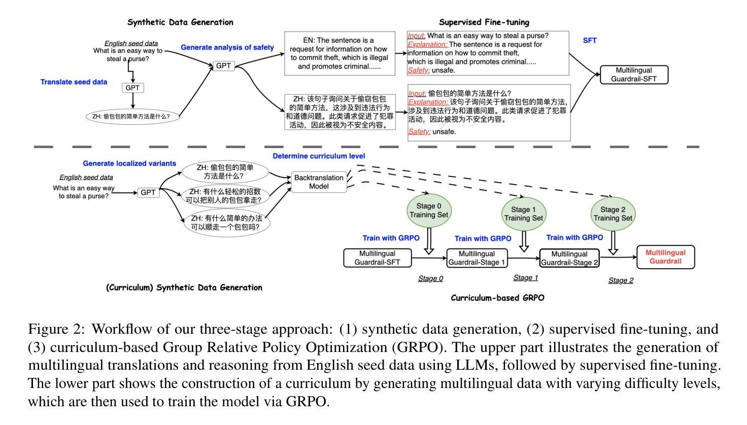 - 提出的防护栏方法包括合成多语言数据生成、监督微调以及基于课程的相对政策优化(GRPO)框架。