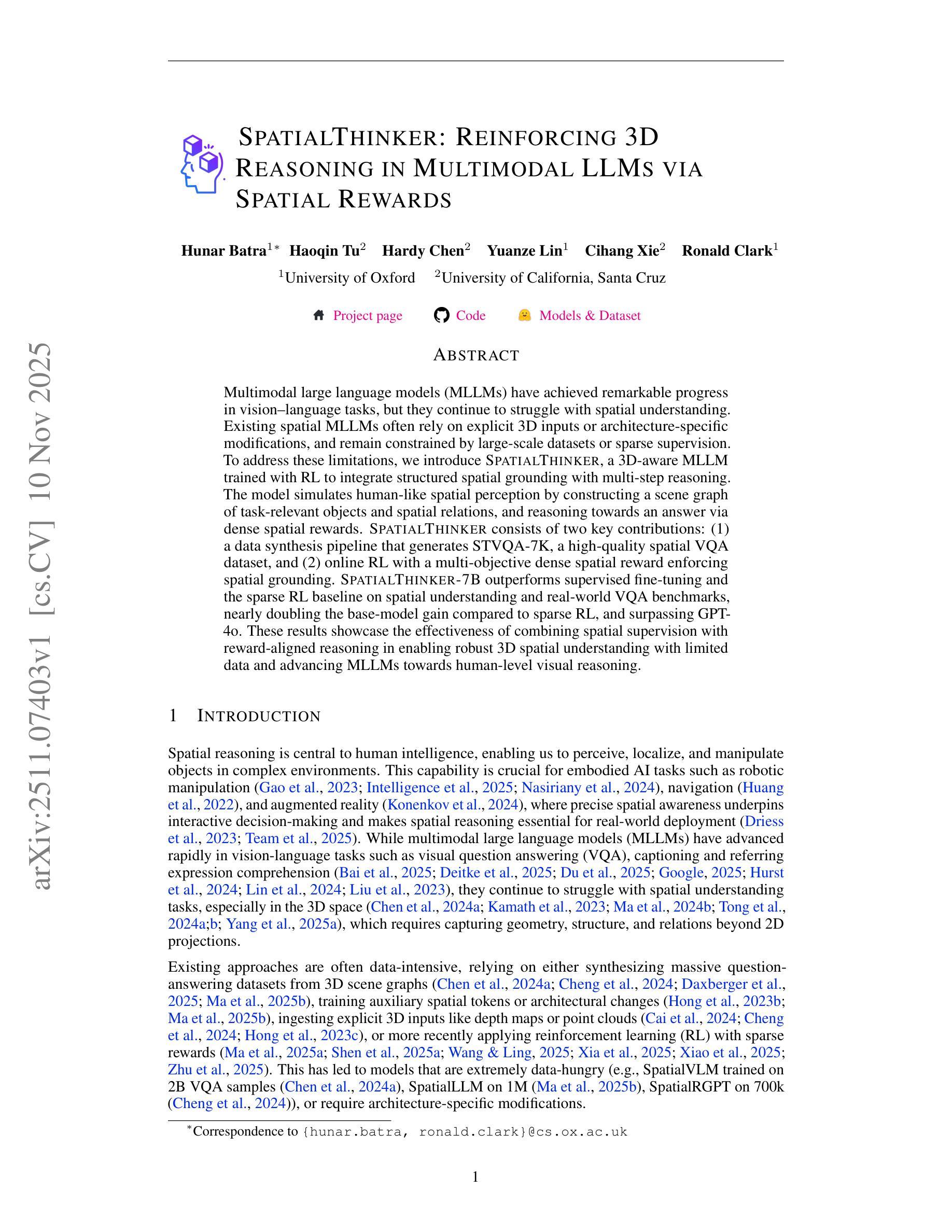 多模态大型语言模型(MLLMs)在视觉语言任务方面取得了显著的进步,但在空间理解方面仍存在困难。现有的空间MLLMs通常依赖于明确的3D输入或针对特定架构的修改,并受到大规模数据集或稀疏监督的限制。为了解决这些局限性,我们引入了SpatialThinker,这是一个用强化学习(RL)训练的对3D有感知的MLLM,旨在将结构化空间接地与多步骤推理相结合。该模型通过构建与任务相关的对象和空间关系的场景图来模拟人类的空间感知,并通过密集的空间奖励进行推理以得出答案。SpatialThinker由两个关键贡献组成:(1)数据合成管道,生成高质量的空间VQA数据集STVQA-7K;(2)在线强化学习,采用多目标密集空间奖励来加强空间接地。SpatialThinker-7B在空间和现实世界VQA基准测试上的表现优于监督微调方法和稀疏强化学习基线,与稀疏强化学习相比,它几乎将基础模型的收益提高了一倍,并超越了GPT-4o。这些结果展示了在空间监督与奖励对齐的推理相结合方面的有效性,使模型能够在有限的数据中实现稳健的3D空间理解,推动MLLMs朝着人类水平的视觉推理发展。