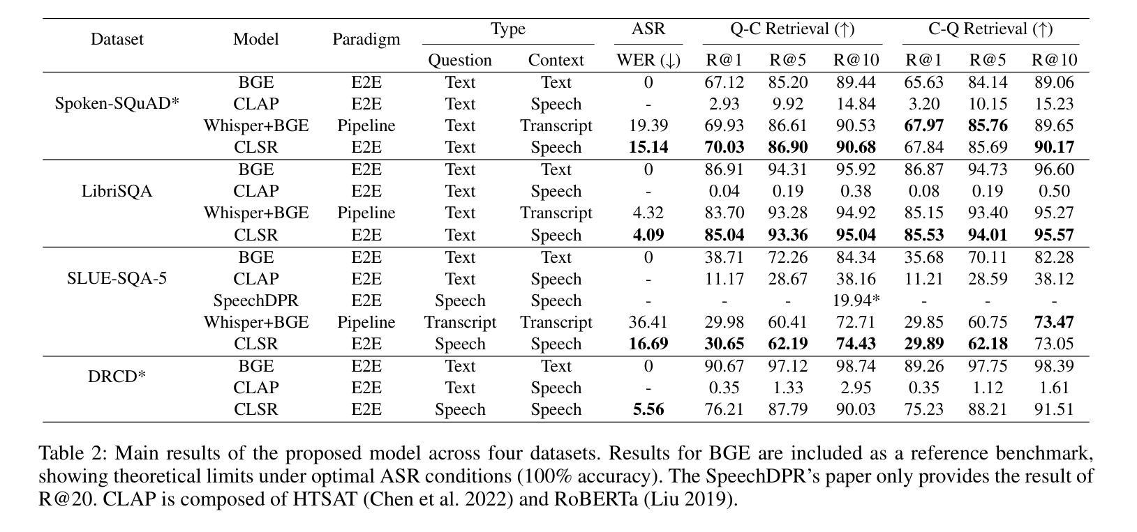 - 提出CLSR,一种端到端的对比语言-语音检索器,有效提取长音频中的相关问题片段。