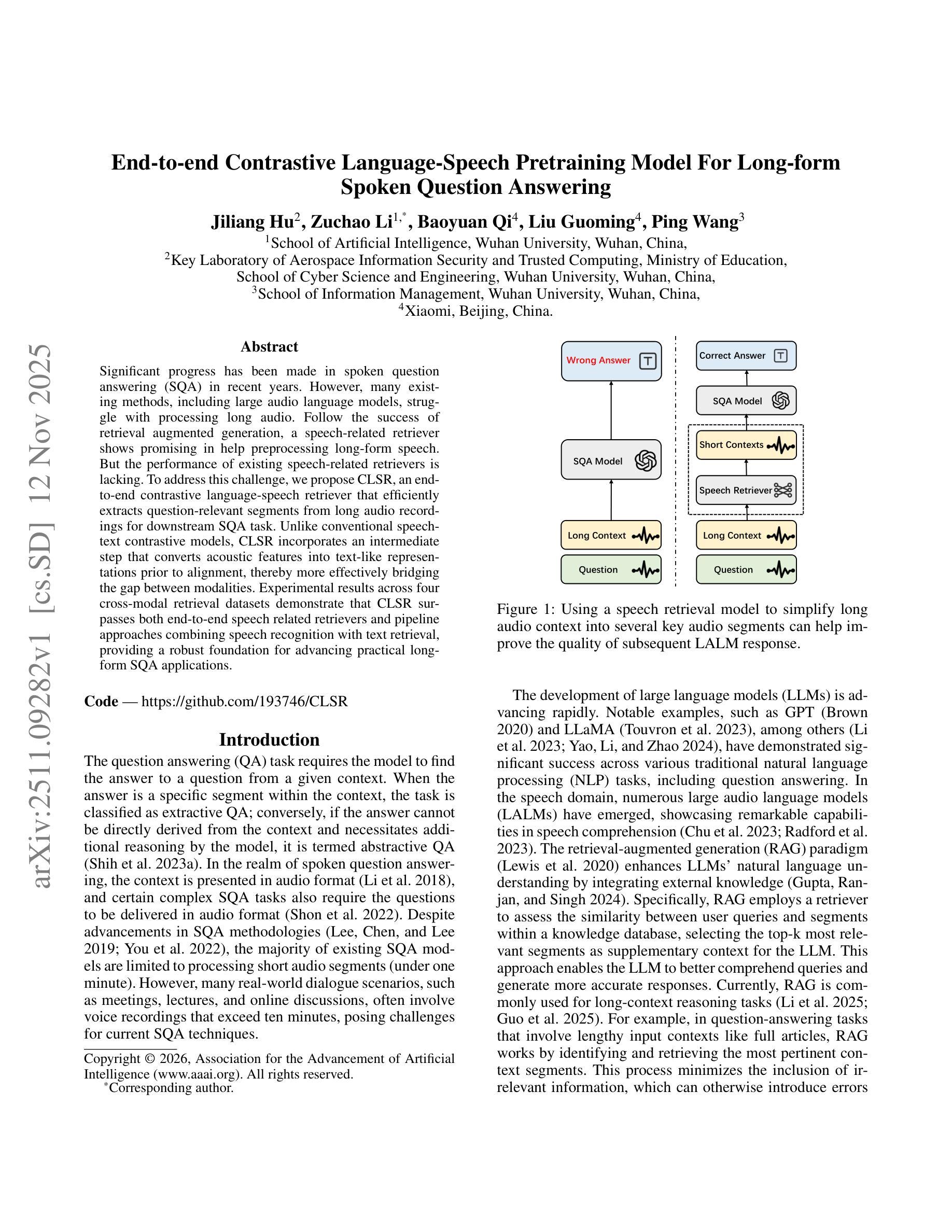 近年语音问答(SQA)领域取得显著进展,但现有方法在处理长音频时仍面临挑战。为应对这一难题,本文提出CLSR,一种端到端的对比语言-语音检索器,可从长音频记录中有效提取与问题相关的片段,供下游SQA任务使用。不同于传统的语音-文本对比模型,CLSR在对齐之前增加了一个将声学特征转换为文本表示的中间步骤,从而更有效地弥合了不同模态之间的差距。实验结果表明,CLSR在四种跨模态检索数据集上的表现均超越了端到端的语音相关检索器和结合语音识别与文本检索的管道方法,为推进实用长形式SQA应用提供了稳健基础。