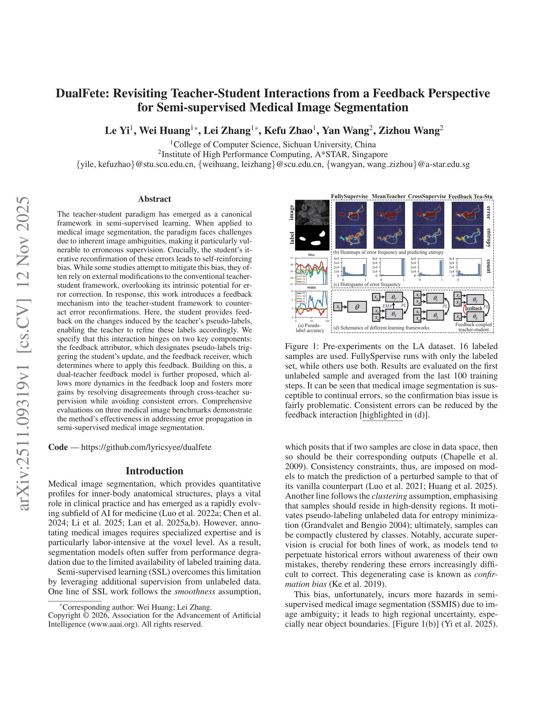 师徒范式已成为半监督学习中的经典框架。当应用于医学图像分割时,由于图像固有的模糊性,该范式面临挑战,使其特别容易受到错误的监督。关键的是,学生对这些错误的迭代确认会导致自我加强的偏见。虽然一些研究试图减轻这种偏见,但它们通常依赖于对传统师徒框架的外部修改,忽视了其内在的错误纠正潜力。为此,这项工作将反馈机制引入师徒框架以对抗错误确认。在这里,学生提供有关教师伪标签引起的变化的反馈,使教师能够相应地改进这些标签。我们指定这种互动依赖于两个关键组成部分:反馈属性指定触发学生更新的伪标签,反馈接收器确定应用反馈的地方。在此基础上,进一步提出了双教师反馈模型,使反馈回路更加动态,通过跨教师监督解决分歧,避免持续错误,从而实现更多收益。在三个医学图像基准测试上的综合评估证明了该方法在半监督医学图像分割中解决错误传播的有效性。