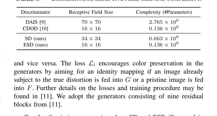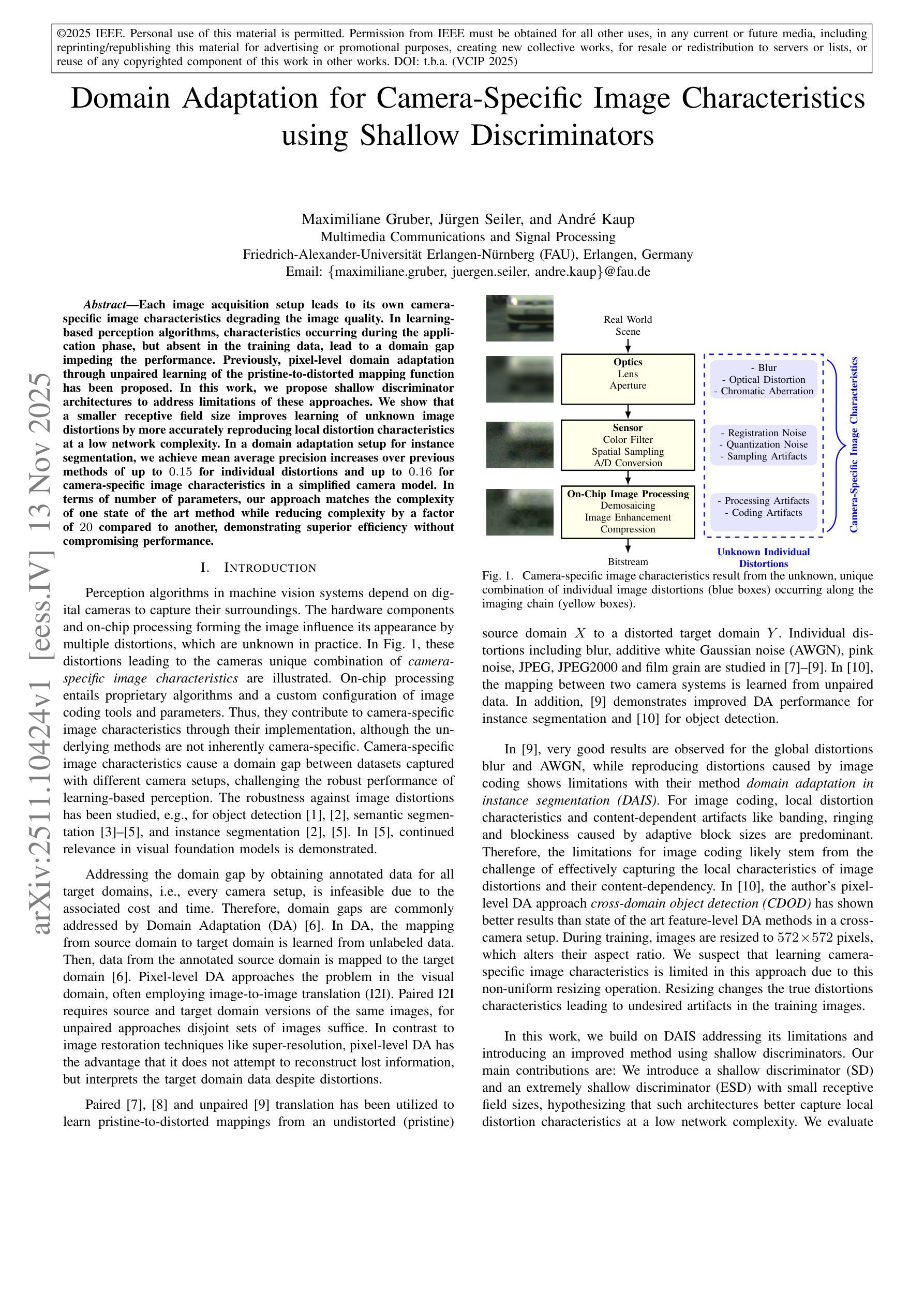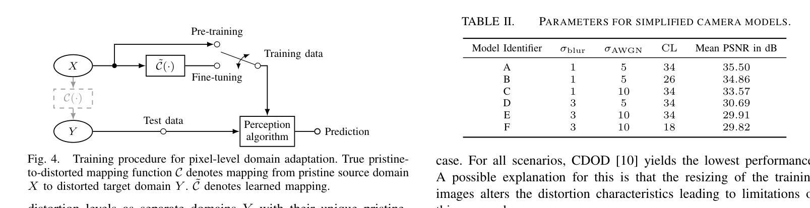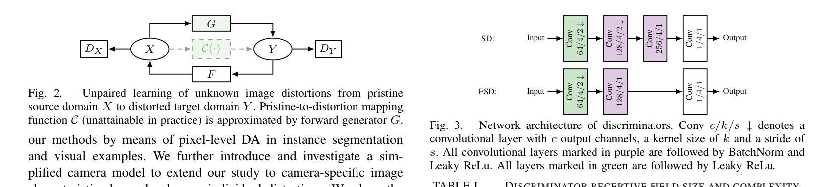 每个图像采集设置都会导致其特有的相机特定图像特征,从而降低了图像质量。在基于学习的感知算法中,应用阶段出现但在训练数据中不存在的特征会导致域差距,从而影响性能。先前已经提出了通过原始到失真的映射函数的非配对学习来进行像素级域适应。在这项工作中,我们提出了浅判别器架构来解决这些方法的局限性。我们表明,较小的感受野尺寸通过更准确地再现局部失真特征,在低网络复杂度下改进了对未知图像失真的学习。在实例分割的域适应设置中,我们实现了平均精度提高,与以前的方法相比,针对单个失真的提高幅度高达0.15,针对简化相机模型中的相机特定图像特性的提高幅度高达0.16。就参数数量而言,我们的方法与最新技术状态的复杂度相匹配,但与另一种方法相比减少了20倍的复杂度,在不影响性能的情况下展示了更高的效率。