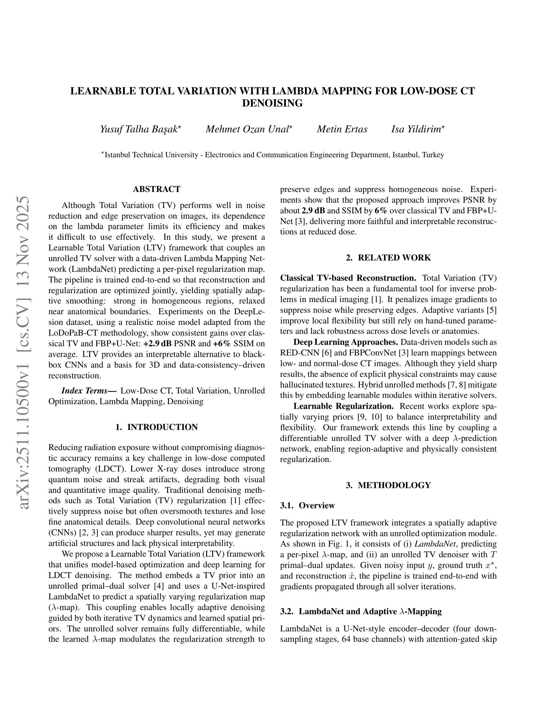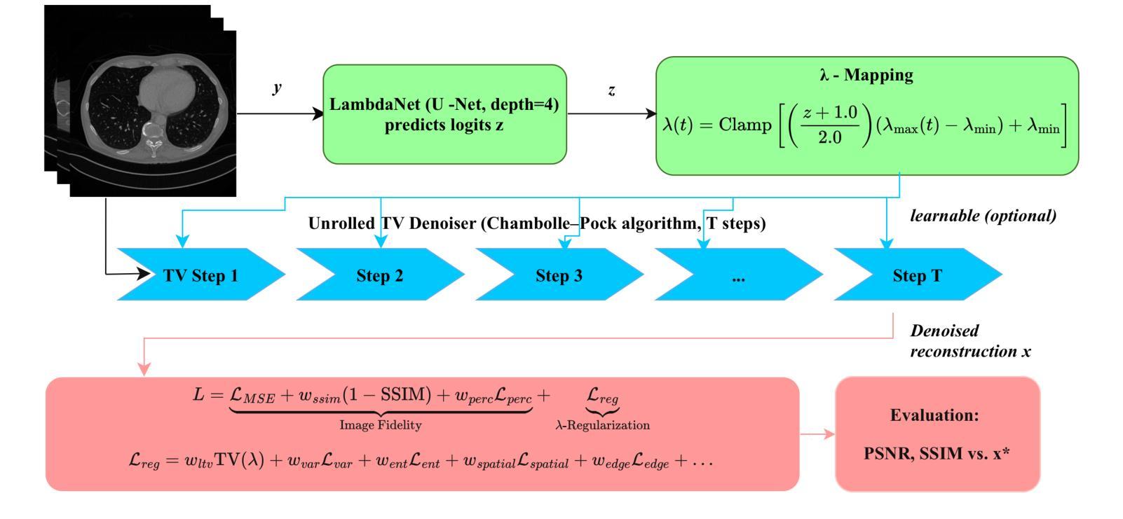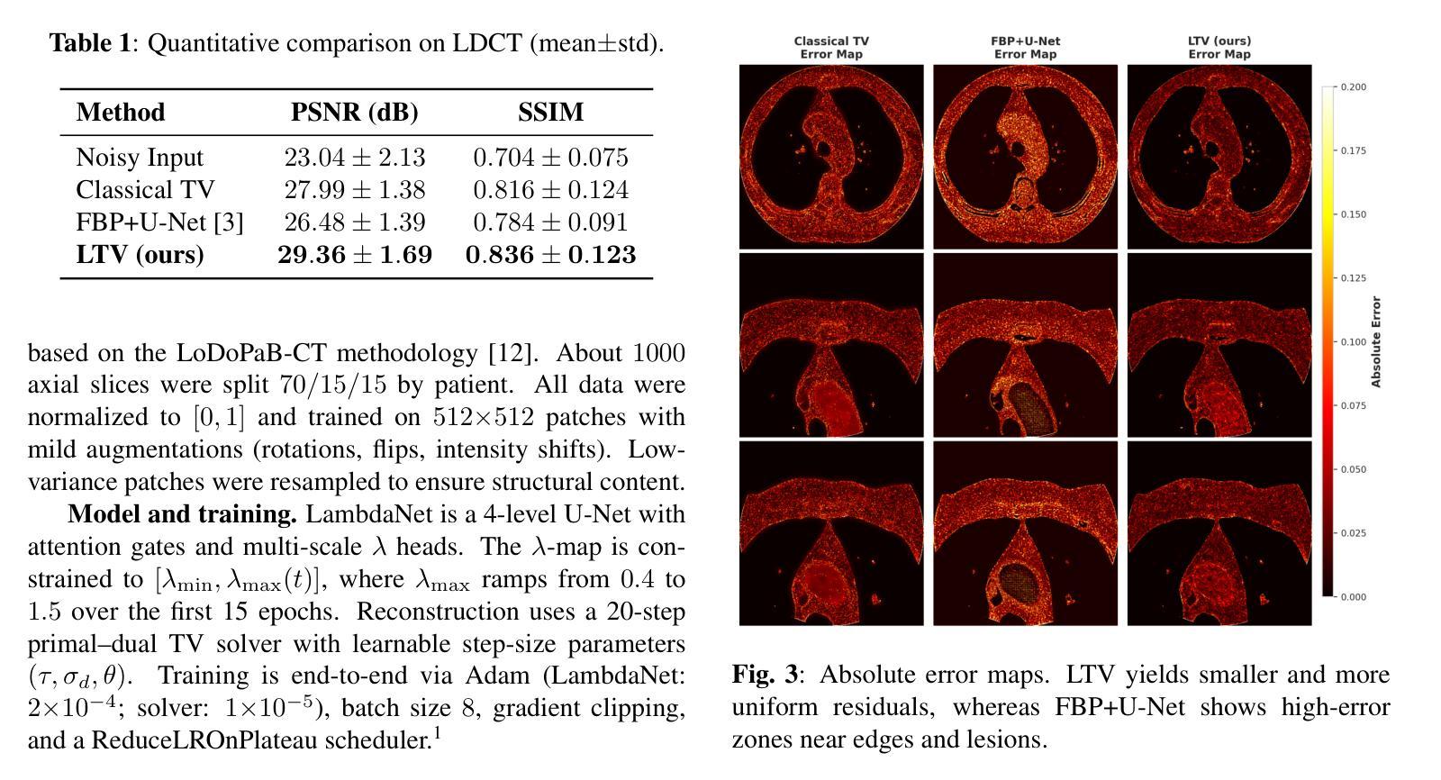 尽管总变差(TV)在图像降噪和边缘保持方面表现良好,但其对lambda参数的依赖限制了其效率,并且难以有效地使用。在本研究中,我们提出了一种可学习的总变差(LTV)框架,它将展开的TV求解器与数据驱动的Lambda映射网络(LambdaNet)相结合,预测每个像素的正则化图。该管道是端到端进行训练的,使重建和正则化能够联合优化,产生空间自适应平滑:在均匀区域中强烈,在解剖边界附近放松。在采用来自LoDoPaB-CT方法论的现实噪声模型的DeepLesion数据集上的实验表明,与经典TV和FBP+U-Net相比,LTV具有一致的优势,平均PSNR提高2.9 dB,SSIM提高6%。LTV为黑箱卷积神经网络提供了一种可解释的替代方案,并为3D和数据一致性驱动的重建提供了基础。我们的代码可在以下网址找到:https://github.com/itu-biai/deep_tv_for_ldct