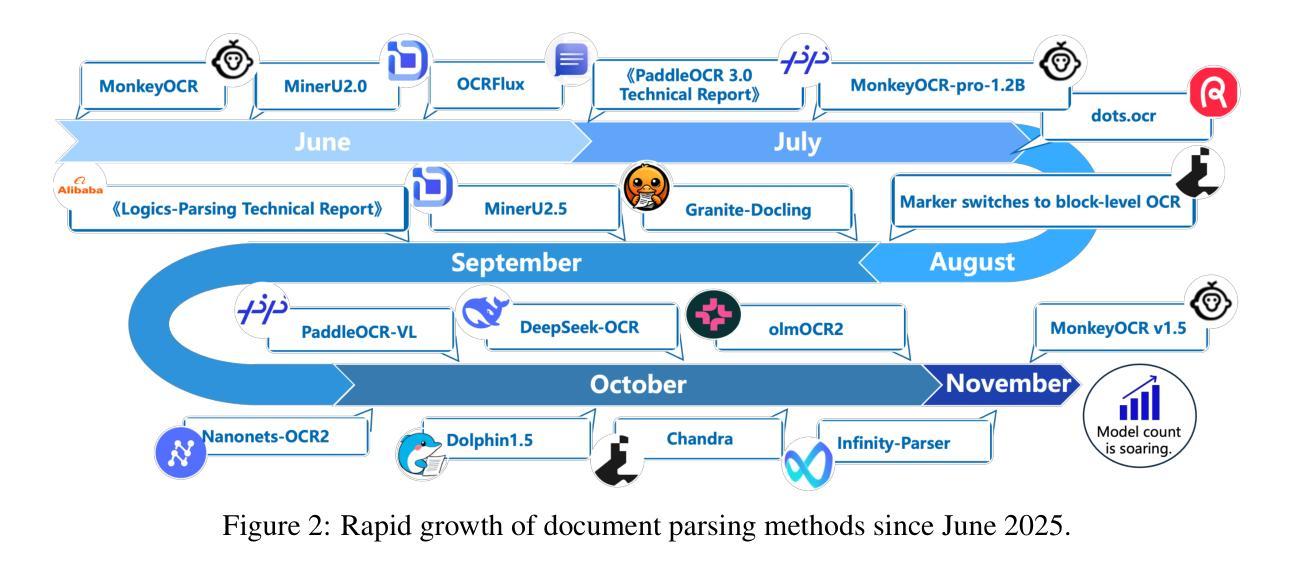 - 在OmniDocBench v1.5上的实验表明,MonkeyOCR v1.5达到最新性能水平,优于PPOCR-VL和MinerU 2.5。