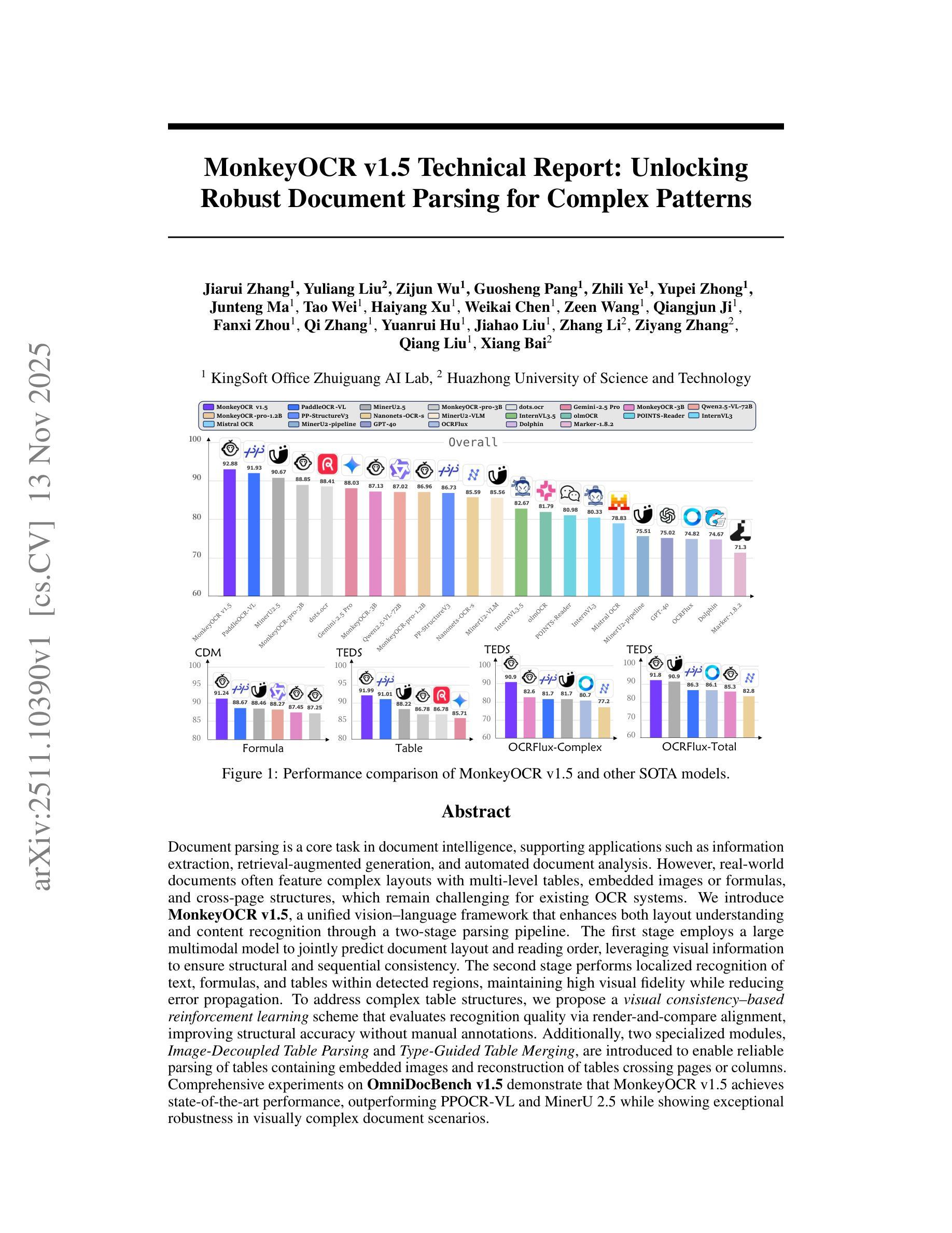 文档解析是文档智能的核心任务之一,支持信息提取、检索增强生成和自动化文档分析等多种应用。然而,现实世界的文档通常具有复杂的布局,包含多层次表格、嵌入的图像或公式以及跨页结构,这对现有OCR系统仍然具有挑战性。我们推出了MonkeyOCR v1.5,这是一个统一的视觉语言框架,通过两阶段解析管道增强布局理解和内容识别。第一阶段采用大型多模态模型联合预测文档布局和阅读顺序,利用视觉信息确保结构和顺序一致性。第二阶段对检测到的区域进行文本、公式和表格的局部识别,保持高视觉保真度,同时减少错误传播。针对复杂的表格结构,我们提出了一种基于视觉一致性强化学习方案,通过渲染和比较对齐来评估识别质量,提高结构准确性,无需手动注释。此外,还引入了Image-Decoupled Table Parsing和Type-Guided Table Merging两个专用模块,能够实现包含嵌入图像的表格可靠解析以及跨页或列的表格重建。在OmniDocBench v1.5上的综合实验表明,MonkeyOCR v1.5达到了最先进的性能水平,优于PPOCR-VL和MinerU 2.5,在视觉复杂的文档场景中表现出卓越的稳健性。