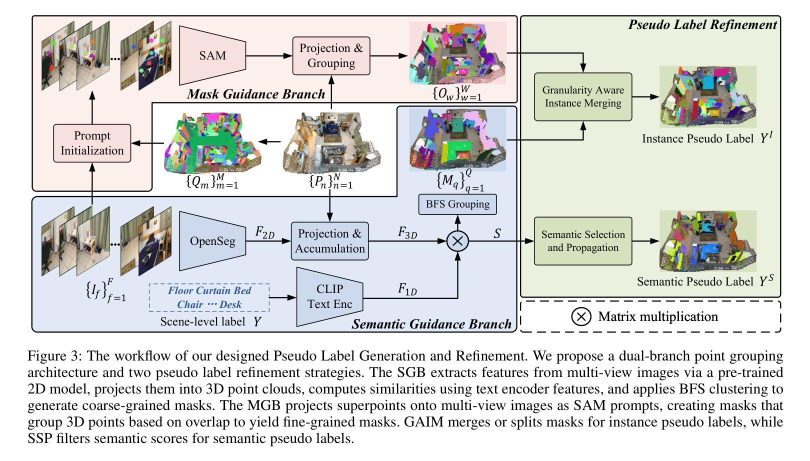 - 在第一阶段中引入了双分支点分组模块,使用场景级别标注生成伪标签,结合语义和掩膜线索指导伪标签的生成。
