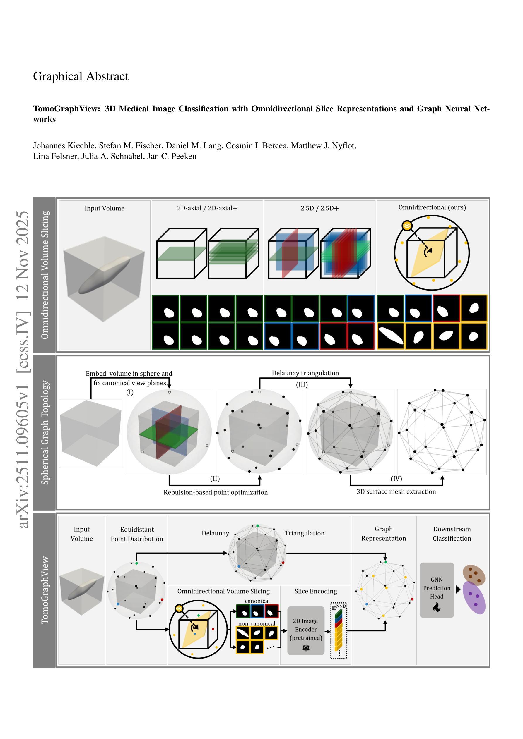 随着医学断层扫描检查数量的不断增加,必须开发能够提取全面成像特征的自动化方法,以促进肿瘤特征化等下游任务,同时帮助医生管理日益增长的工作量。然而,由于体积数据中的复杂空间关系和长距离依赖关系,3D医学图像分类仍然是一项具有挑战性的任务。从头开始训练模型会受到数据不足的限制,缺乏大规模的3D多模式数据集限制了3D医学成像基础模型的发展。然而,最近的研究突出了原本在自然图像上训练的2D视觉基础模型在医学图像分析中的强大特征提取潜力。尽管取得了这些进展,但现有的将2D模型应用于3D体积数据的切片分解方法仍不理想。传统的体积切片策略依赖于标准平面(如轴向、矢状面或冠状面),当目标结构与标准化观看平面不对齐时,可能无法充分捕捉其空间范围。此外,现有的切片级聚合策略很少考虑保持体积结构,导致切片间空间连贯性的丧失。为了克服这些局限性,我们提出了TomoGraphView这一新型框架,它结合了全向体积切片和基于球形图的特征聚合。我们在http://github.com/compai-lab/2025-MedIA-kiechle公开分享了我们可访问的代码库,并在https://pypi.org/project/OmniSlicer提供了用户友好的全向体积切片库。