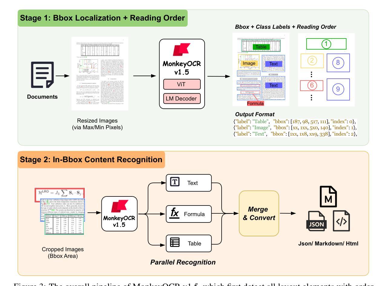 - 引入了两阶段解析管道,第一阶段预测文档布局和阅读顺序,第二阶段进行局部文本、公式和表格识别。