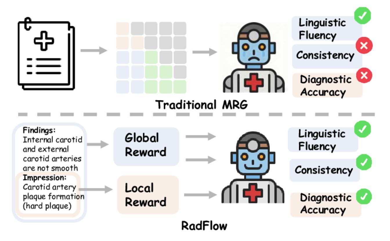 该文介绍了一种名为RadFlow的医学报告生成系统,该系统采用分层工作流引导的强化优化框架,旨在模拟放射科医生撰写报告的结构化过程。RadFlow通过构建临床报告的结构化模型、引入奖励层次结构以及针对关键病例的政策优化机制,提高了报告的连贯性和临床准确性。实验证明,RadFlow相较于其他系统,能生成更高质量的医学报告。