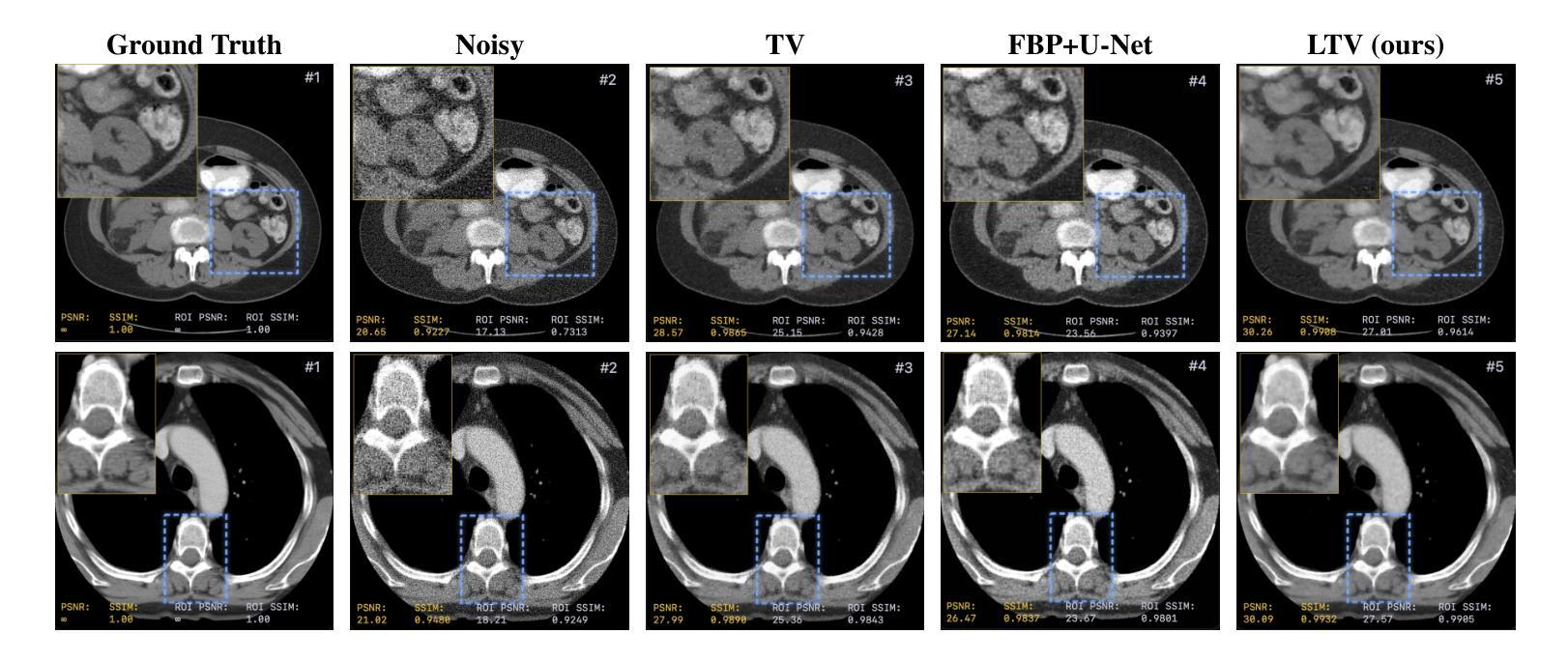 - 在DeepLesion数据集上的实验表明,与经典的总变分和FBP+U-Net相比,LTV提供了更好的图像重建结果,PSNR和SSIM分别提高了2.9 dB和6%。