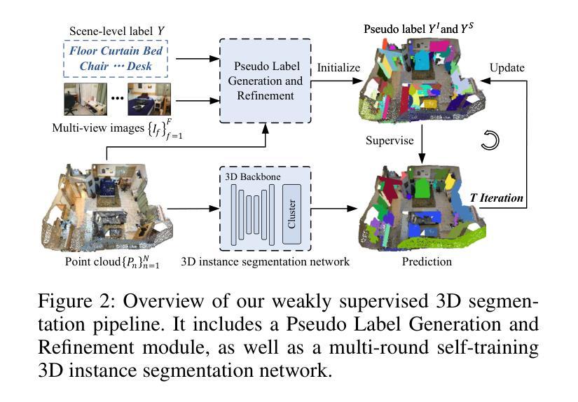 弱监督3D实例分割对于3D场景理解至关重要,尤其是随着数据规模的增长和全监督方法相关的高标注成本。现有方法主要依赖于两种形式的弱监督:一点一击标注和边界框标注,两者的目标都是减少标注工作量。然而,这些方法仍面临一些挑战,包括标注过程劳动强度高、复杂性高以及依赖专家标注者。为了解决这些挑战,我们提出了DBGroup,这是一个两阶段的弱监督3D实例分割框架,它利用场景级标注作为更高效和可扩展的替代方案。在第一阶段,我们引入了一个双分支点分组模块,该模块以多视角图像中提取的语义和掩膜线索为指导生成伪标签。为了进一步提高标签质量,我们开发了两种细化策略:粒度感知实例合并和语义选择和传播。第二阶段涉及在端到端实例分割网络上进行多轮自训练,使用精炼的伪标签。此外,我们还引入了一个实例掩膜过滤策略,以解决伪标签内部的不一致性。大量实验表明,DBGroup与稀疏点级监督的3D实例分割方法相比具有竞争力,同时超越了最先进的场景级监督的3D语义分割方法。代码可通过https://github.com/liuxuexun/DBGroup获取。