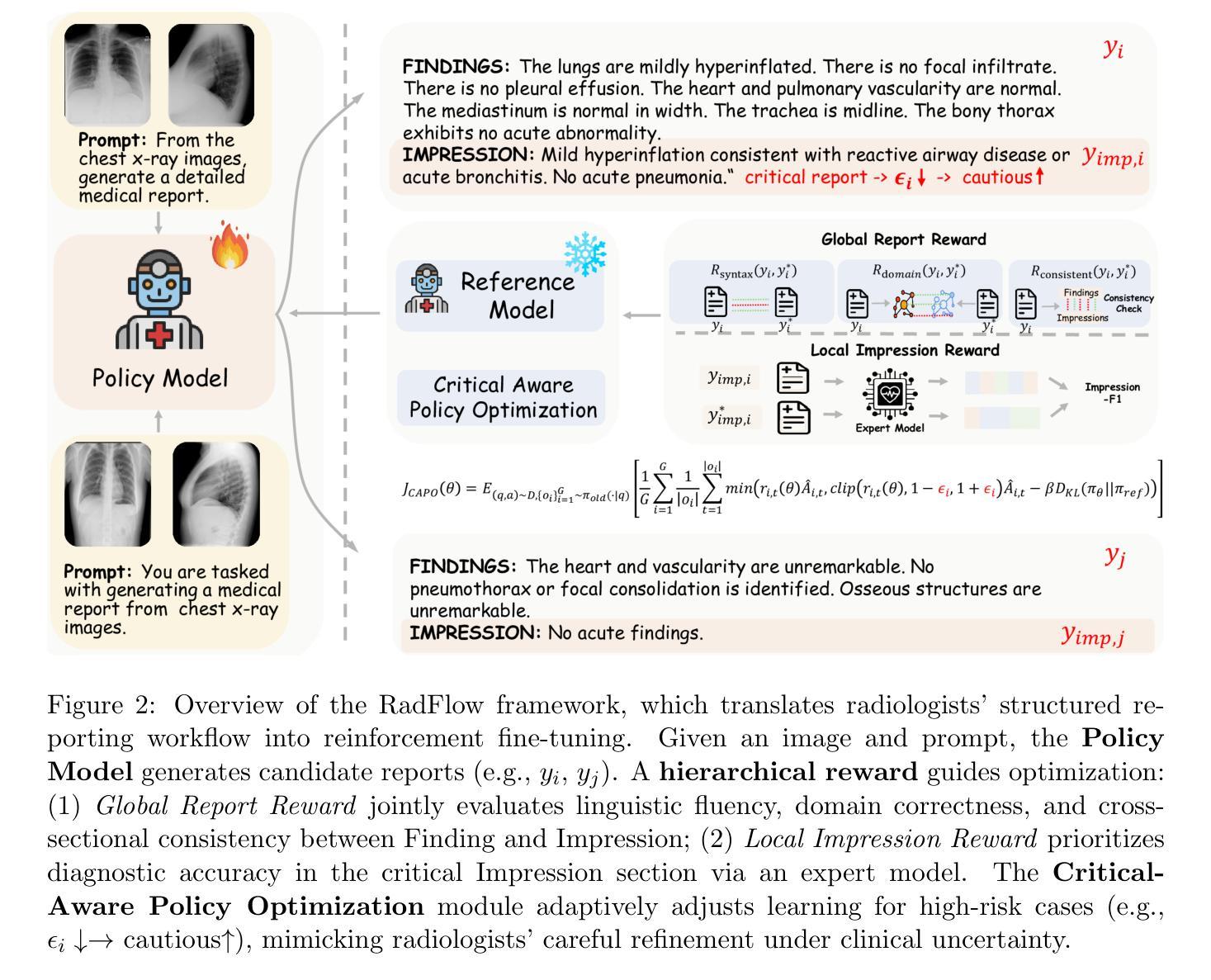 放射科医生通过结构化工作流程撰写诊断报告:他们描述所见,将其总结为印象,并在临床关键病例中仔细精炼陈述。然而,大多数现有的医学报告生成系统(MRG)将报告视为平坦的序列,忽略了这种分层组织,导致描述性和诊断内容之间出现不一致。为了将模型行为与真实世界的报告实践保持一致,我们提出了RadFlow,这是一个分层的工作流驱动强化优化框架,它显式地模拟临床报告的结构化特性。RadFlow引入了一个基于临床的奖励层次结构,该结构反映了放射报告的组织方式。全局层面上,奖励融合了语言流畅性、医学领域正确性,以及发现与印象之间的横截面一致性,促进连贯且符合临床实际的故事叙述。局部层面上,部分特定的奖励强调印象质量,反映了其在诊断准确性中的核心作用。此外,一种关键意识政策优化机制自适应地调整高风险或临床敏感病例的学习规则,模拟放射科医生在记录关键发现时的精细修正行为。这些组件共同将结构化报告范式转化为强化微调过程,使模型能够生成既符合语言一致性又符合临床实际的报告。在胸部X射线和颈动脉超声数据集上的实验表明,与最新基线相比,RadFlow持续提高了诊断连贯性和总体报告质量。