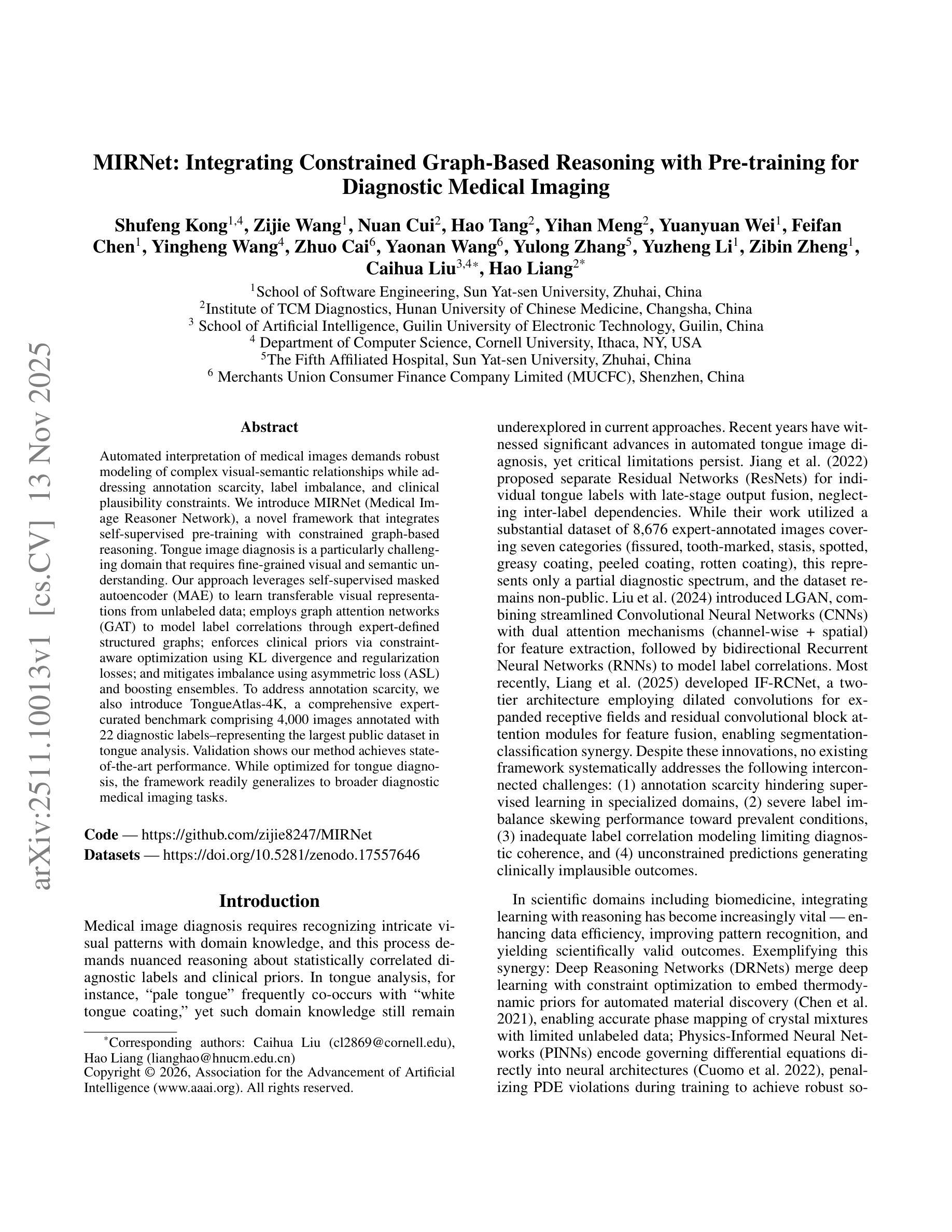 本文介绍了医疗图像自动解读中的MIRNet框架,该框架集成了自监督预训练和基于约束图的推理。针对舌图像诊断这一具有挑战的领域,MIRNet利用自监督掩码自动编码器学习可迁移的视觉表示,使用图注意力网络对专家定义的结构图进行标签关联建模,通过KL散度和正则化损失实施临床先验约束感知优化,并采用不对称损失和增强集成来缓解不平衡问题。为解决标注稀缺问题,还推出了TongueAtlas-4K数据集。验证结果表明,该方法达到业界领先水平,并易于推广至更广泛的医疗图像诊断任务。