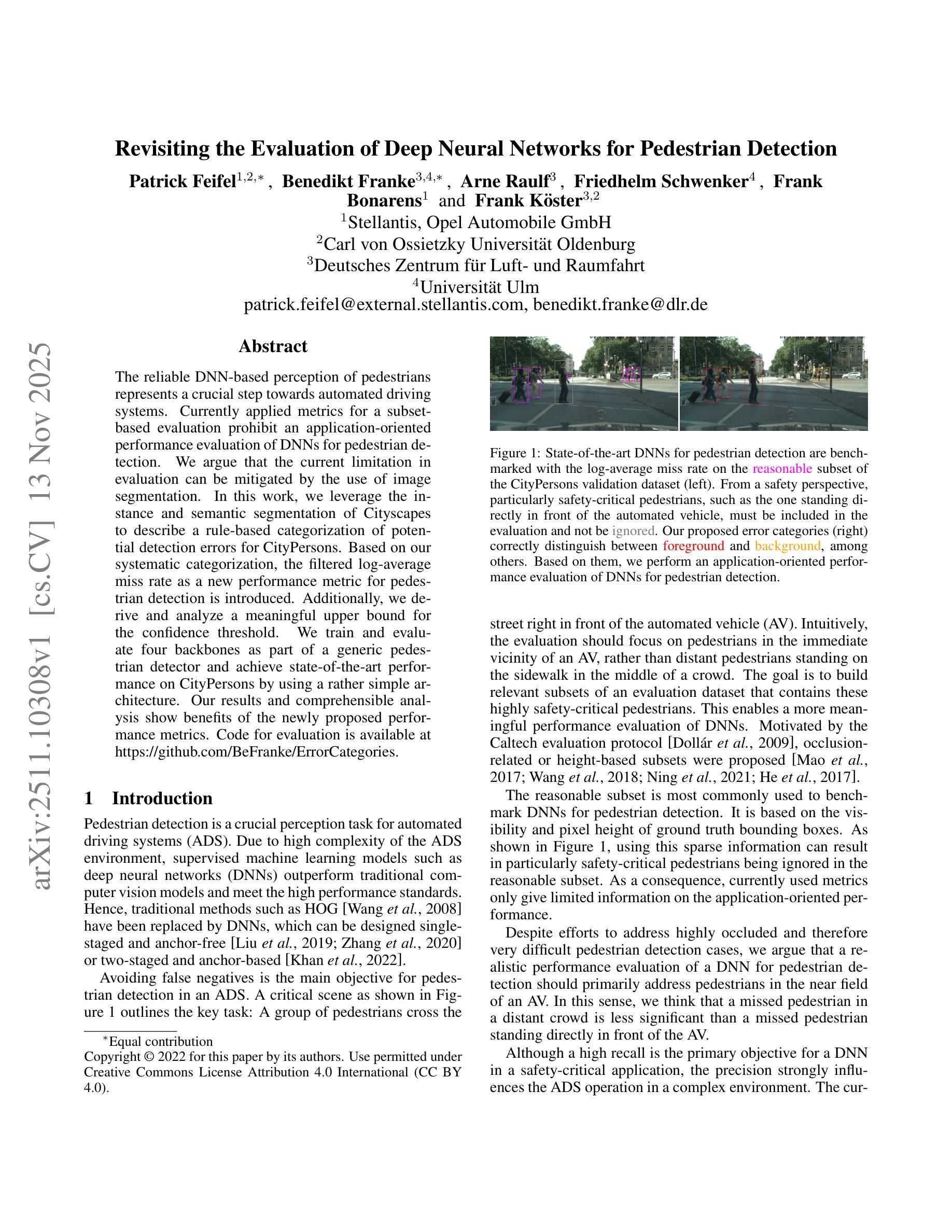 在自动驾驶系统中,可靠的行人检测是至关重要的一步。然而,当前性能基准展现出了弱点。对于验证数据集中的不同子集目前所应用的评价指标,无法真实评估深度神经网络(DNN)在行人检测方面的性能。图像分割为街道场景提供了精细信息,可以作为自动区分行人检测中不同类型错误的起点。在这项工作中,提出了8种不同的行人检测错误类别,并针对这些错误类别提出了新的性能比较指标。我们使用新指标来比较APD简化版的各种骨干网络,并展示了一种更精细且稳健的方式来对比模型彼此之间的性能,特别是在安全性能上。通过使用相对简单的架构,我们在CityPersons-reasonable(无需额外训练数据)上实现了最新技术水平。