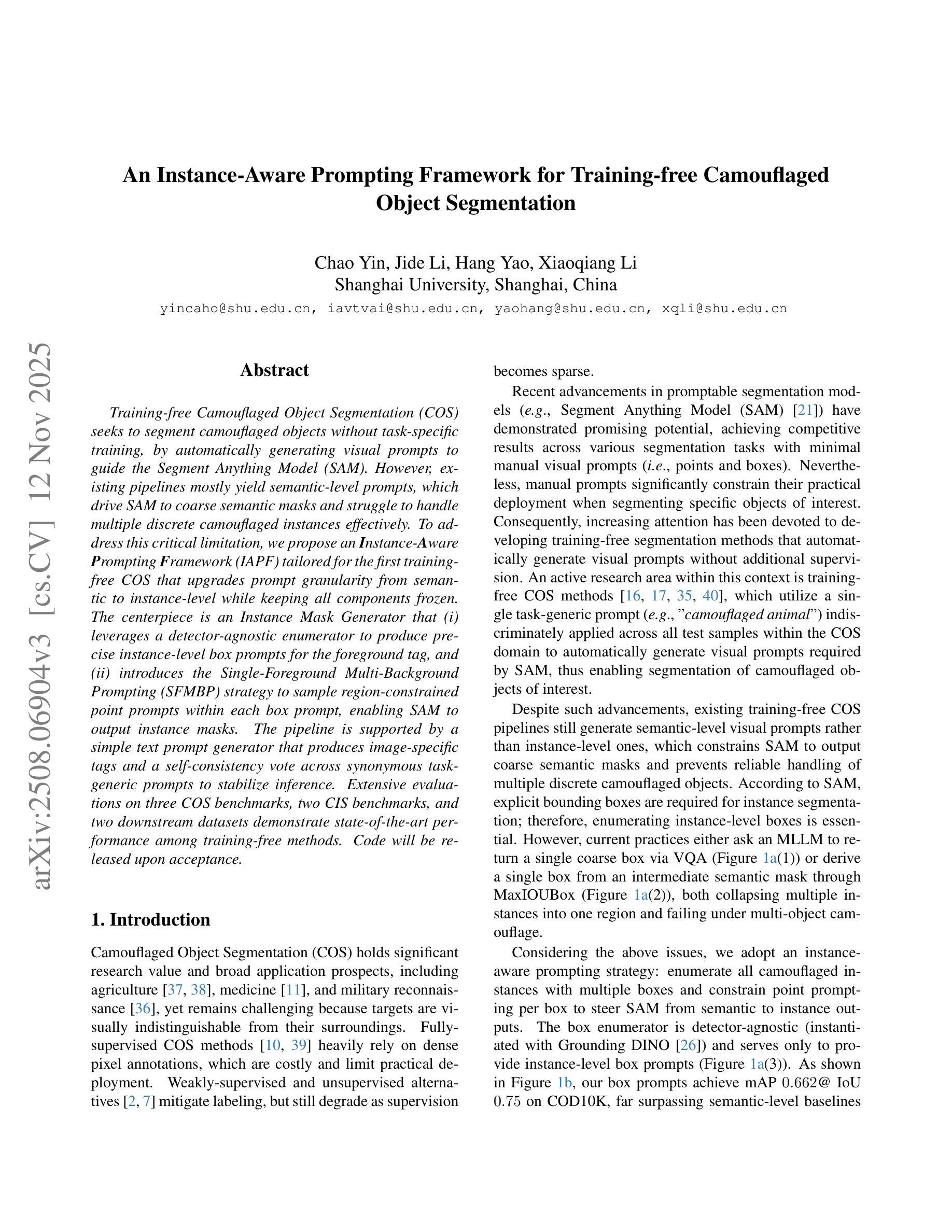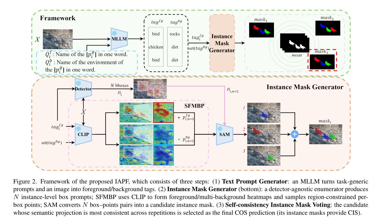 无训练COS(Camouflaged Object Segmentation)对象分割方法通过自动生成视觉提示来引导分割任何模型(SAM),无需特定任务训练。但现有流程主要产生语义级别的提示,导致SAM产生粗糙的语义掩膜,难以有效处理多个离散隐蔽实例。为解决此限制,我们提出面向首个无训练COS的实例感知提示框架(IAPF),将提示粒度从语义升级到实例级别,同时保持所有组件冻结。通过实例掩膜生成器(Instance Mask Generator)产生精确实例级框提示和单前景多背景提示策略(SFMBP),使SAM输出实例掩膜。该流程由文本提示生成器支持,产生图像特定标签,并通过同义词通用任务提示的自我一致性投票来稳定推断。在三个COS基准测试、两个CIS基准测试和两个下游数据集上的广泛评估显示,该方法在无训练方法中表现最佳。