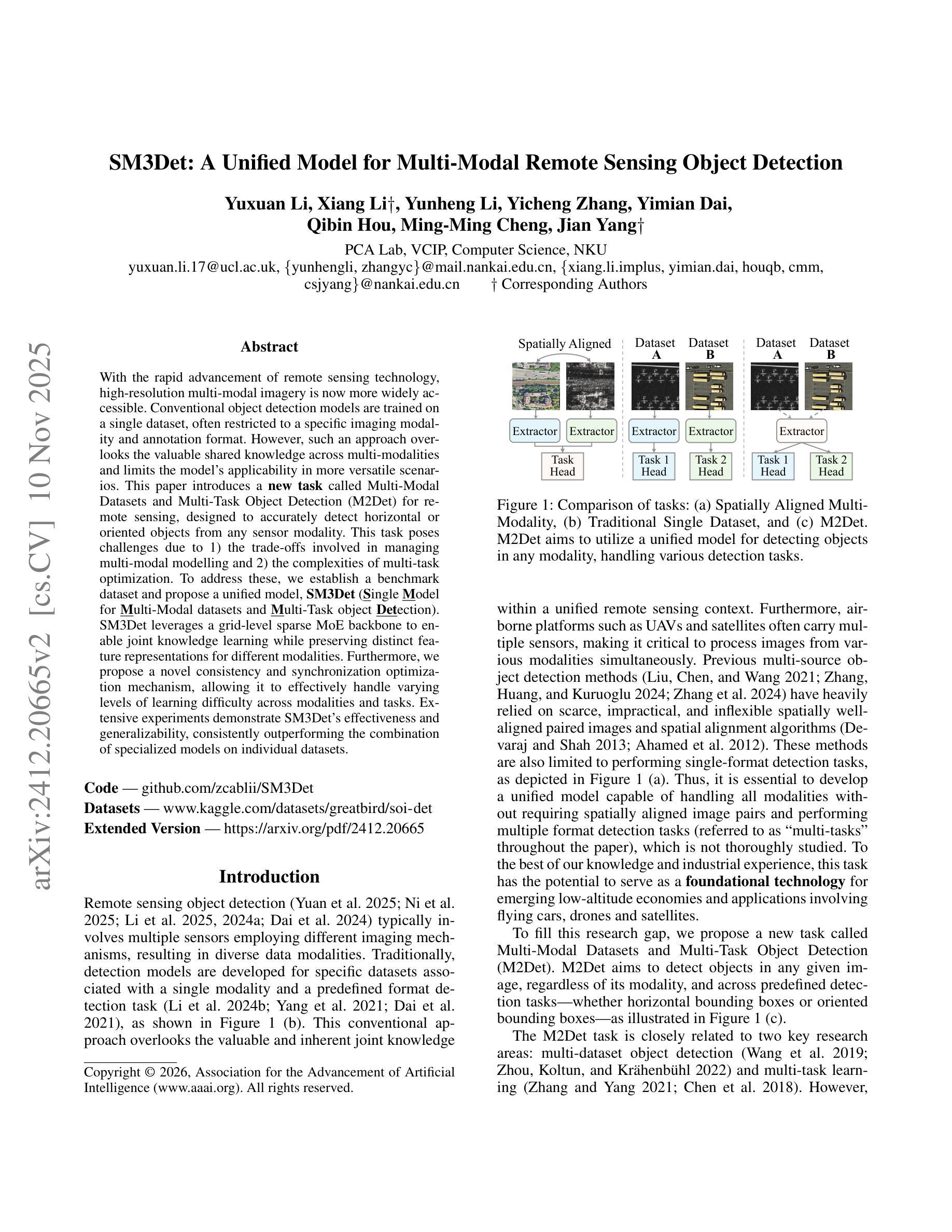 随着遥感技术的快速发展,高分辨率多模态影像现在更加普及。本文提出了遥感中的多模态数据集多任务目标检测(M2Det)新任务,旨在准确检测任何传感器模态的水平或定向目标。为应对多模态建模和多任务优化的挑战,建立了基准数据集,并提出了统一模型SM3Det。SM3Det利用网格级稀疏MoE骨干网实现联合知识学习,同时保留不同模态的特定特征表示。通过动态调整学习速率,采用一致性同步优化策略,有效处理不同模态和任务的学习难度差异。实验证明SM3Det的有效性和泛化能力,在多个数据集上均优于专项模型。