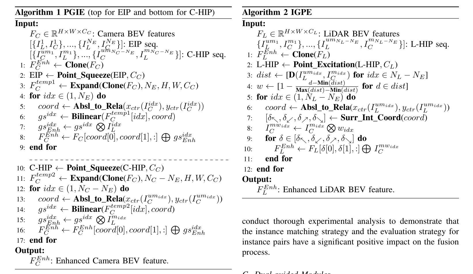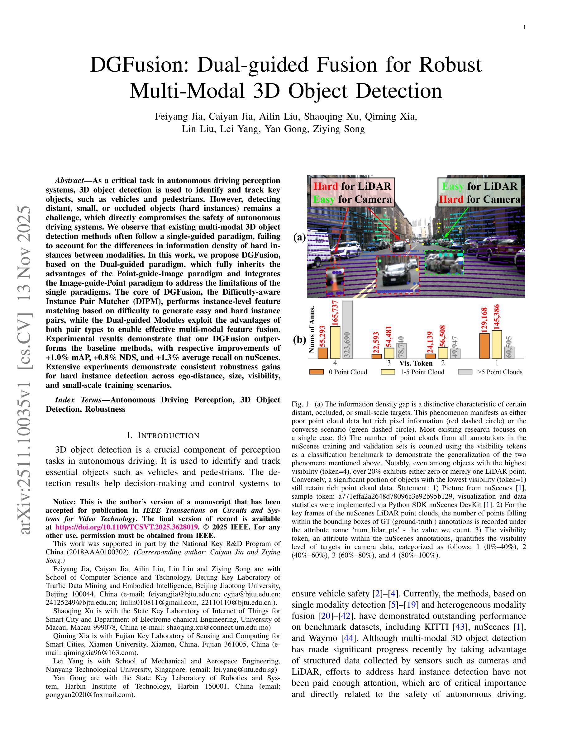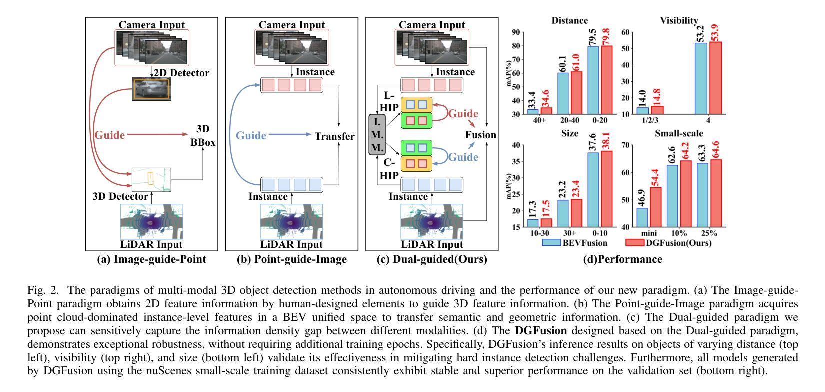 在自动驾驶感知系统中,作为关键任务之一的3D物体检测用于识别和跟踪关键物体,如车辆和行人。然而,检测远距离、小型或遮挡的物体(硬实例)仍然是一个挑战,这直接影响了自动驾驶系统的安全性。我们观察到现有的多模态3D物体检测方法通常采用单一指导范式,未能考虑到不同模态之间硬实例信息密度的差异。在这项工作中,我们提出了基于双重指导范式的DGFusion,它继承了Point-guide-Image范式的优势,并融合了Image-guide-Point范式来解决单一范式的局限性。DGFusion的核心是难度感知实例配对匹配器(DIPM),它基于难度进行实例级特征匹配,以生成容易和困难的实例对,而双重指导模块则利用这两种类型的对的优势来实现有效的多模态特征融合。实验结果表明,我们的DGFusion优于基线方法,在nuScenes上的mAP分别提高了+1.0%,NDS提高了+0.8%,平均召回率提高了+1.3%。大量实验表明,在自我距离、大小、可见性和小规模训练场景下,硬实例检测的稳健性都有一致的收益。