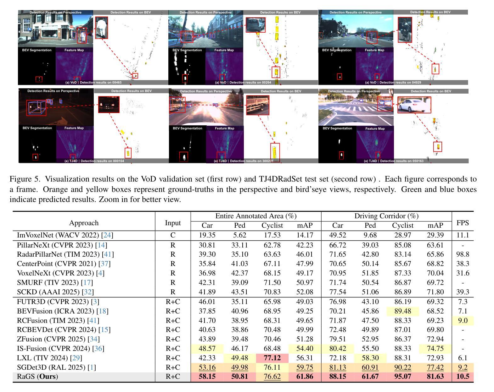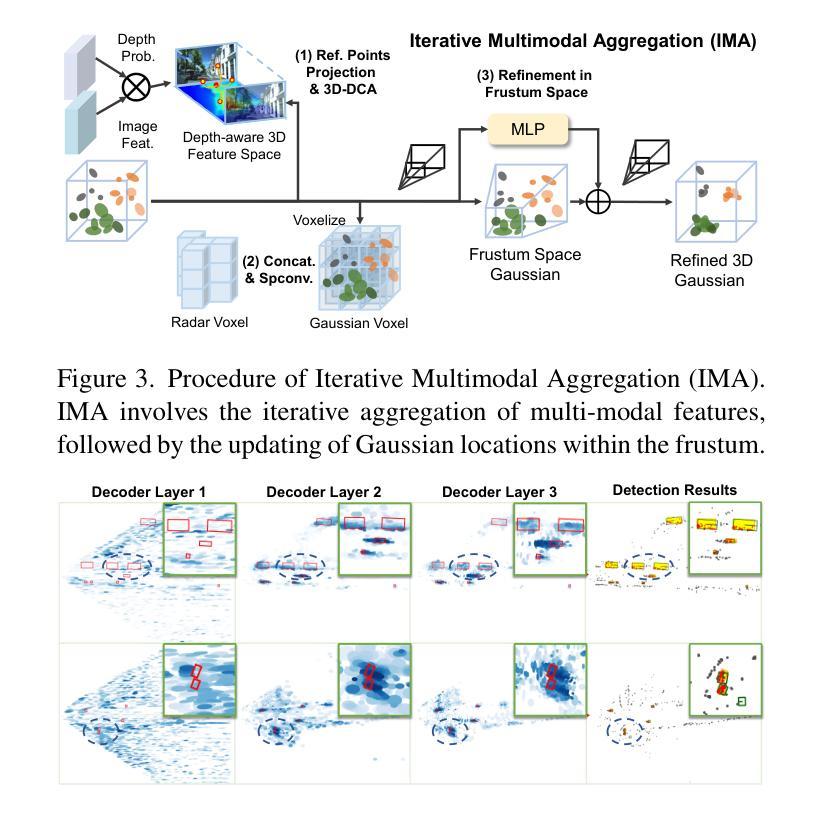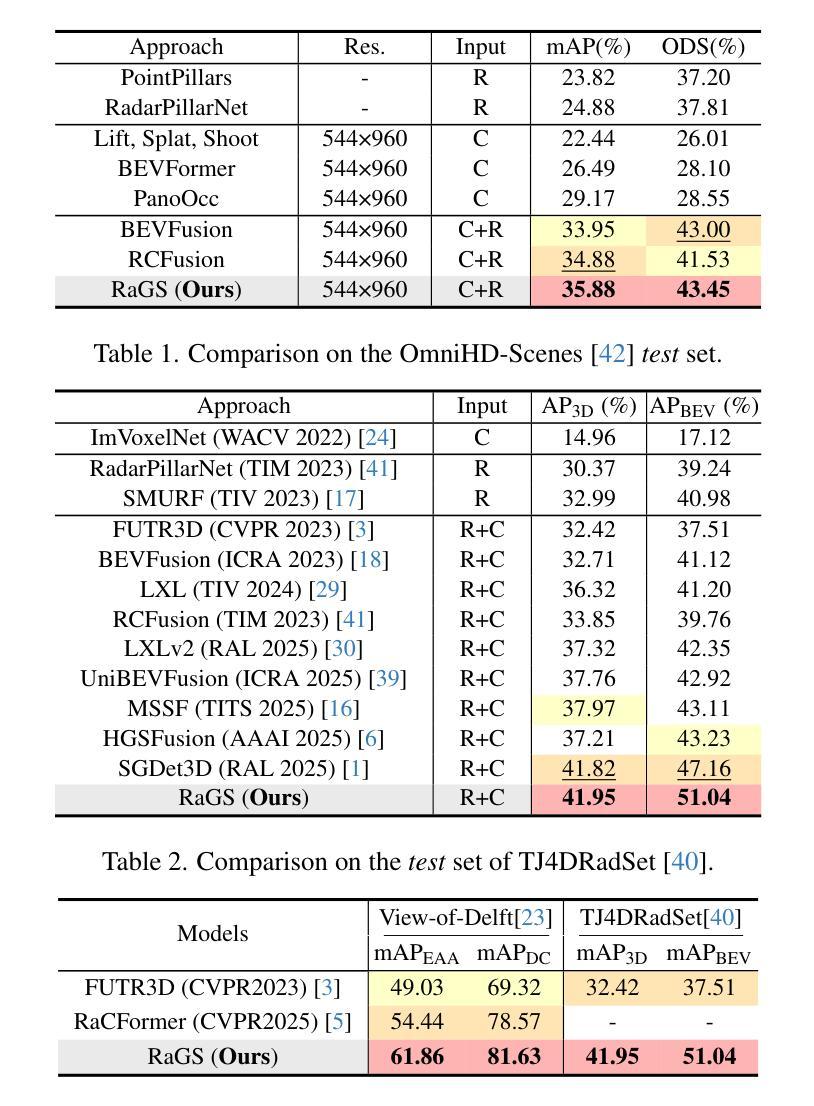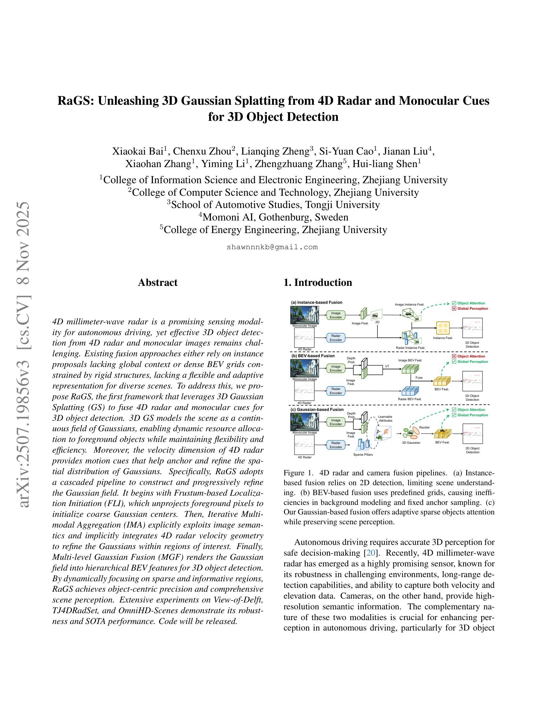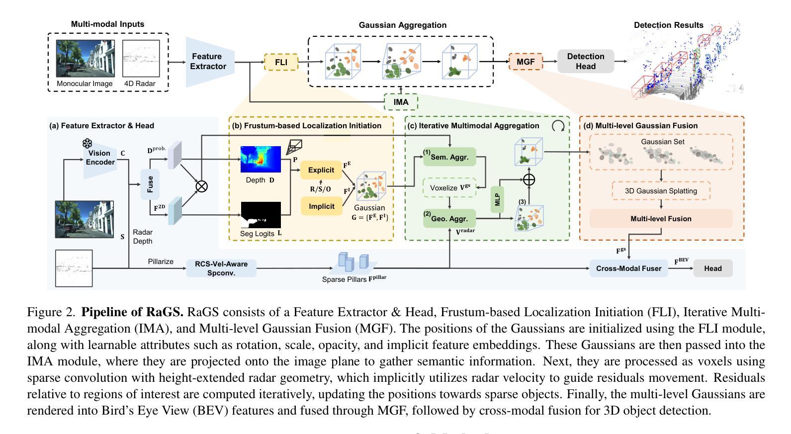 4D毫米波雷达对于自动驾驶来说是一种有前景的感知方式,但从4D雷达和单目图像进行有效的3D对象检测仍然具有挑战性。现有的融合方法要么依赖于缺乏全局上下文的实例提案,要么受限于刚性的密集BEV网格,缺乏灵活和自适应的表示来处理各种场景。为了解决这一问题,我们提出了RaGS,这是一个首次利用3D高斯涂斑(GS)融合4D雷达和单目图像提示进行3D对象检测的框架。3D GS将场景建模为高斯连续场,实现动态资源分配给前景对象,同时保持灵活性和效率。此外,4D雷达的速度维度提供了运动提示,有助于锚定并优化高斯的空间分布。具体来说,RaGS采用级联管道构建并逐步完善高斯场。它始于基于Frustum的定位初始化(FLI),将前景像素反投影以初始化粗略的高斯中心。然后,迭代多模式聚合(IMA)显式利用图像语义并隐式集成4D雷达速度几何来完善感兴趣区域内的高斯。最后,多级高斯融合(MGF)将高斯场呈现为分层BEV特征,用于3D对象检测。RaGS通过动态关注稀疏且信息丰富的区域,实现了以对象为中心的精度和全面的场景感知。在View-of-Delft、TJ4DRadSet和OmniHD-Scenes上的广泛实验证明了其稳健性和SOTA性能。代码将被发布。