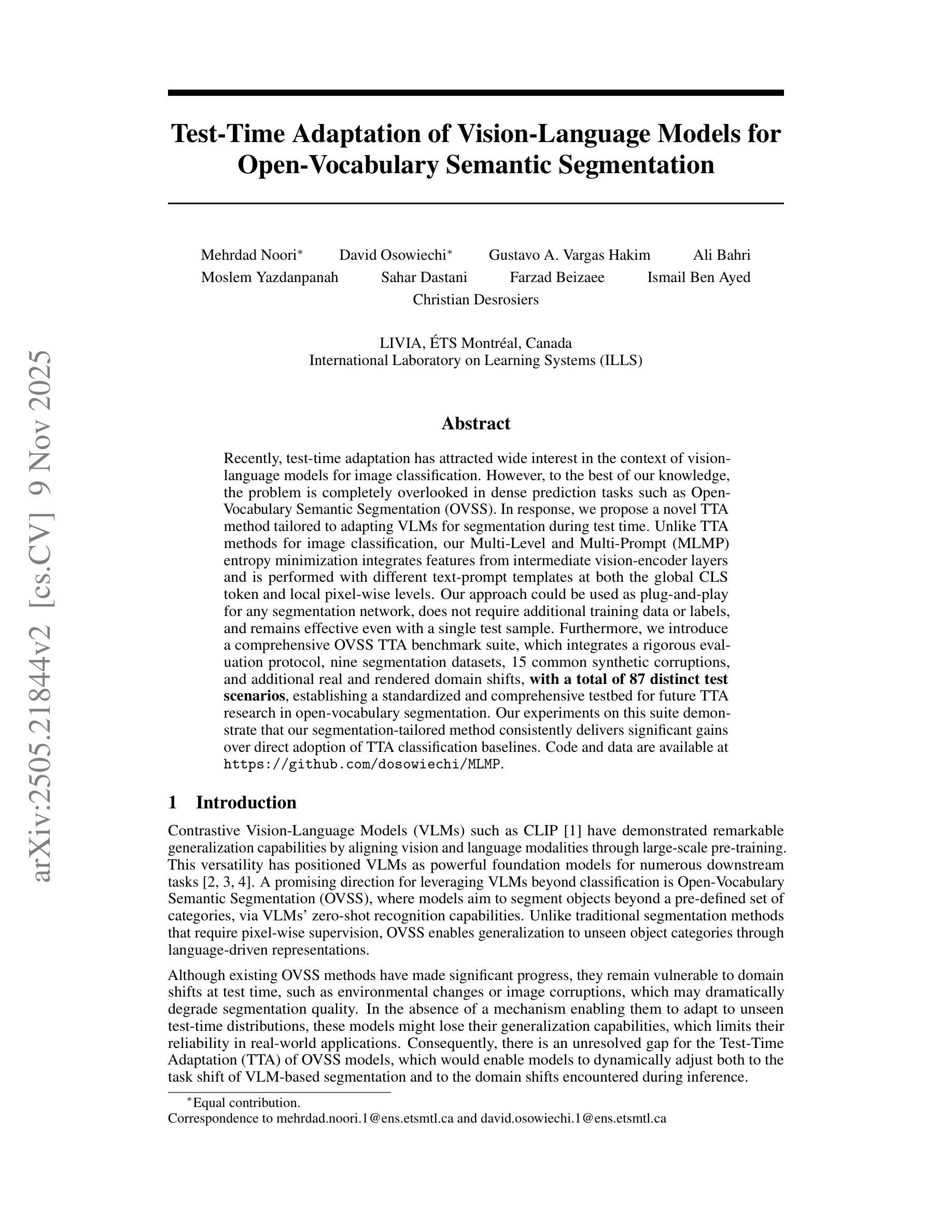 近期,测试时适应(Test-Time Adaptation,TTA)在图像分类的视觉语言模型背景下引起了广泛关注。然而,据我们所知,该问题在密集预测任务(如开放词汇语义分割(OVSS))中完全被忽略。为了解决这个问题,我们提出了一种新型的TTA方法,专门用于在测试时适应用于分割的VLMs。与用于图像分类的TTA方法不同,我们的多层次多提示(Multi-Level and Multi-Prompt,MLMP)熵最小化结合了中间视觉编码器层的特征,并在全局CLS标记和局部像素级使用不同的文本提示模板进行操作。我们的方法可以作为任何分割网络的即插即用工具,无需额外的训练数据或标签,即使在单个测试样本上也能保持有效。此外,我们引入了一个全面的OVSS TTA基准套件,其中包括严格的评估协议、九个分割数据集、15种常见的合成腐蚀,以及额外的真实和渲染域偏移,\textbf{总共有87种不同的测试场景},为未来开放词汇分割的TTA研究建立了标准化和全面的测试平台。在此套件上的实验表明,我们的针对分割的方法在直接采用TTA分类基线时始终实现了显著的收益。代码和数据可在https://github.com/dosowiechi/MLMP中找到。