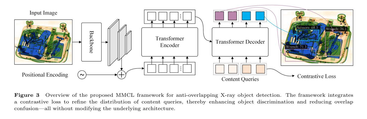 本文提出了一种基于多类最小边距对比学习(MMCL)的框架,用于改善内容查询的分布,实现类内多样性和类间可分性的平衡。该框架通过分组内容查询和采用两种互补的损失组件——多类排除损失和最小边距聚类损失,来提升反重叠物体的检测性能。在三个广泛使用的X光违禁物品检测数据集上的实验结果表明,MMCL有效地增强了反重叠物体检测性能,达到了先进的表现水平。
