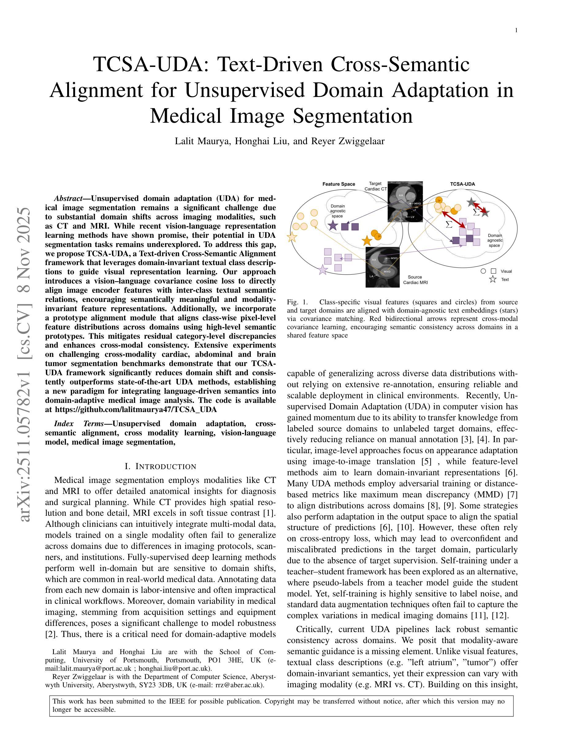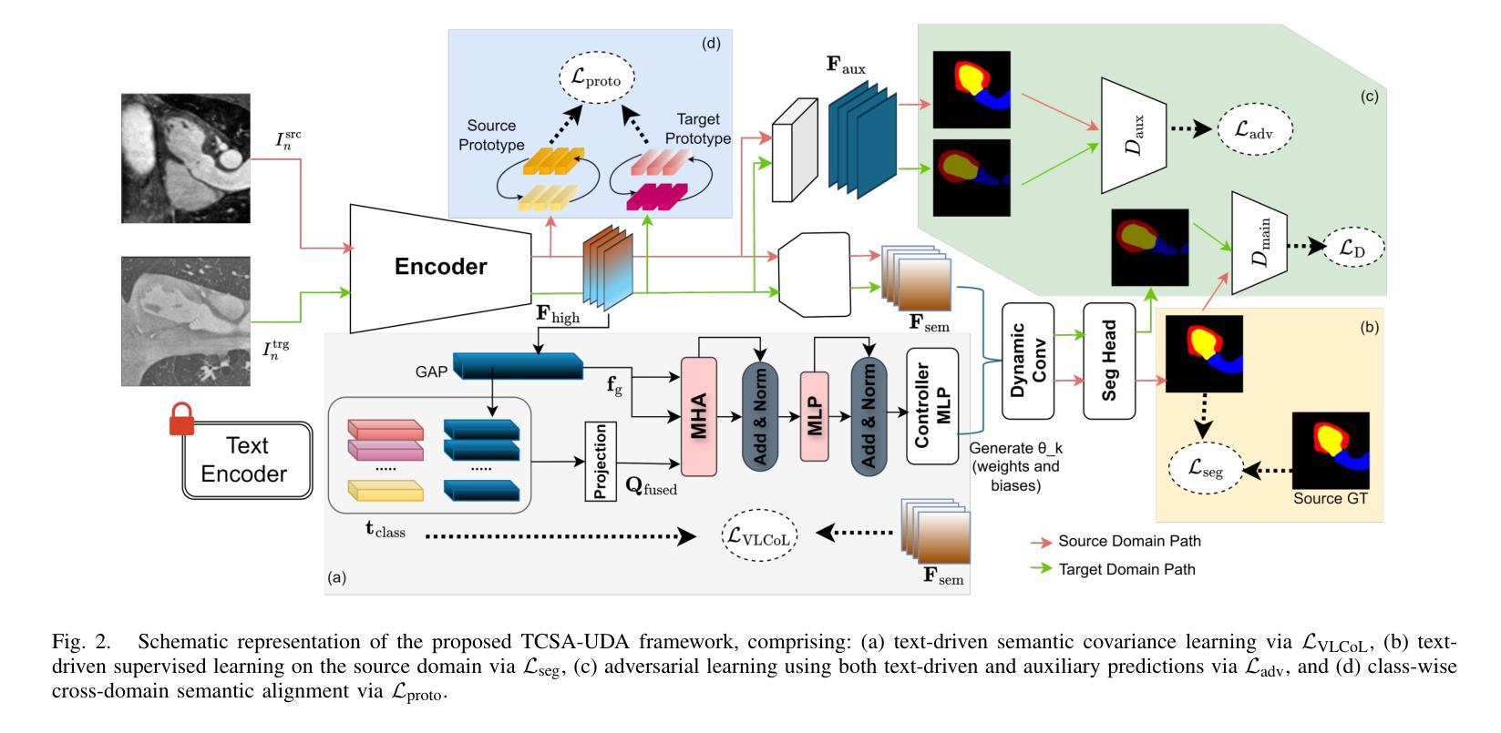 针对医学图像分割的无监督域自适应(UDA)仍然是一个重大挑战,由于成像模式(如CT和MRI)之间存在大量的域偏移。虽然最近的视觉语言表示学习方法显示出了一定的潜力,但它们在UDA分割任务中的潜力仍然未被充分探索。为了弥补这一空白,我们提出了TCSA-UDA,一个文本驱动跨语义对齐框架,它利用域不变的文本类描述来指导视觉表示学习。我们的方法引入了一种视觉语言协方差余弦损失,直接对齐图像编码器特征与跨类文本语义关系,鼓励具有语义意义和模态不变的特征表示。此外,我们加入了一个原型对齐模块,该模块利用高级语义原型来对齐跨域的逐类像素级特征分布。这减轻了剩余的类别级差异并增强了跨模态一致性。在具有挑战性的跨模态心脏、腹部和脑肿瘤分割基准测试上的广泛实验表明,我们的TCSA-UDA框架显著减少了域偏移,并且一致地优于最先进的UDA方法,为将语言驱动的语义集成到域自适应医学图像分析中建立了新的范式。