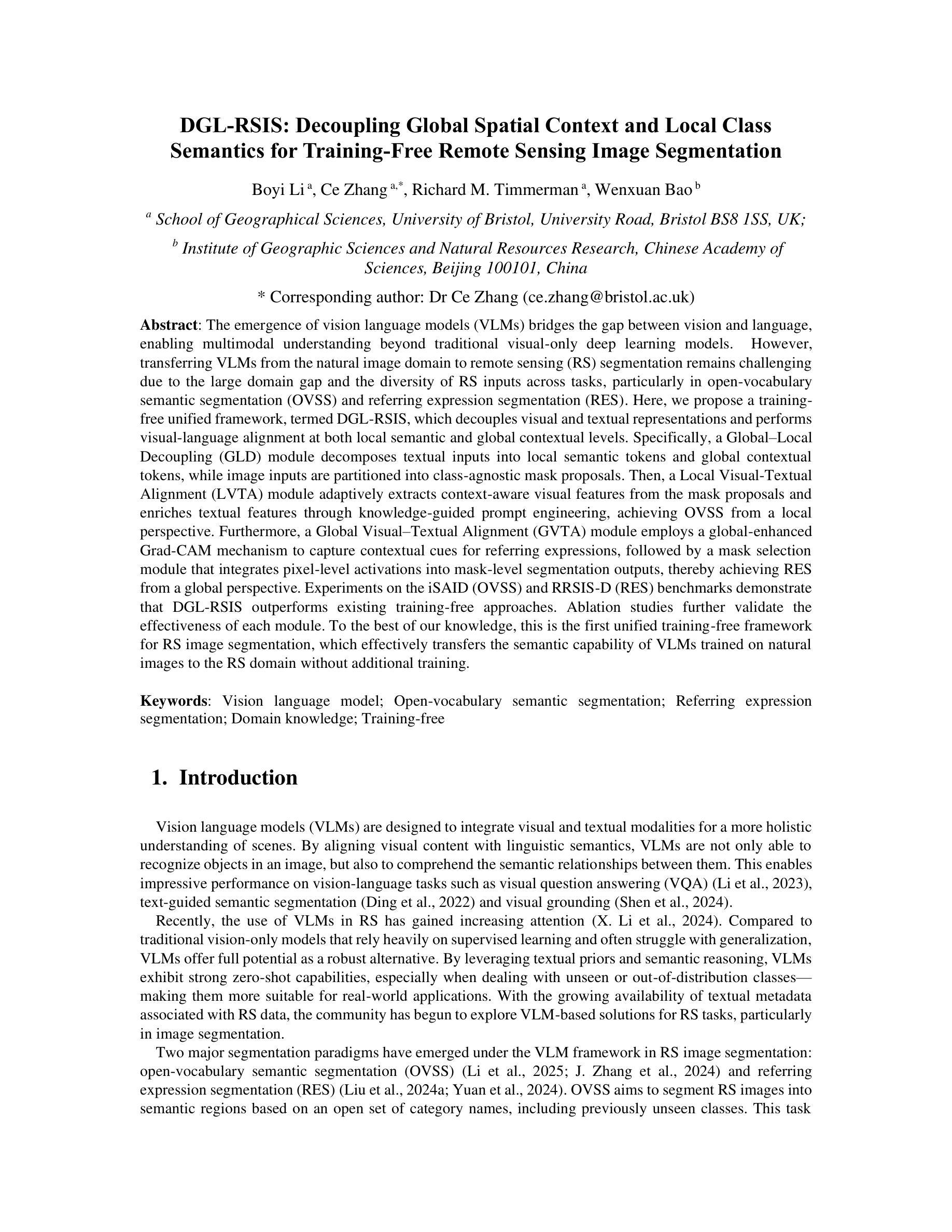 基于视觉语言模型(VLMs)的多模态理解在遥感(RS)图像分割领域展现出巨大潜力。然而,由于领域差距大及遥感输入任务的多样性,VLMs在自然图像领域的应用难以直接迁移到RS分割。本研究提出了一种无需训练的统一框架DGL-RSIS,该框架可在局部语义和全局语境层面进行视觉与语言对齐。实验证明,该框架在iSAID和RRSIS-D基准测试中表现优异。